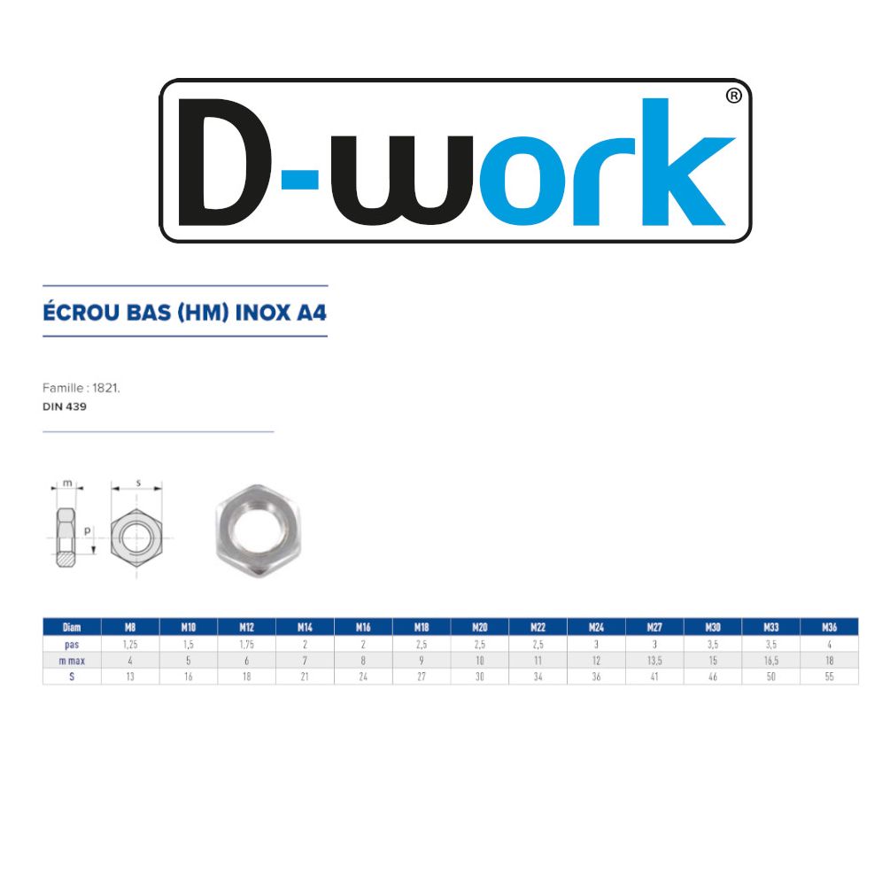 100 Ecrous Hexagonaux Bas M6 mm - DIN 439 - Inox A4 - D-Work