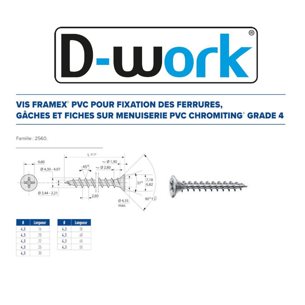 1000 Vis PVC Menuiserie Tête fraisée PH2 Framex 4.3 x 25 mm - Zingué Chromiting Grade 4 - D-Work