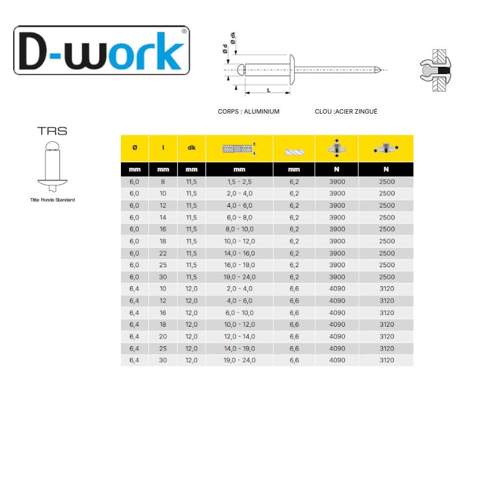 Ref. LEN-6120-6-10En savoir + sur 250 Rivets Aveugles Tête Ronde 6 x 10 mm - GORIVET ALX TRS - Aluminium/Acier - D-Work