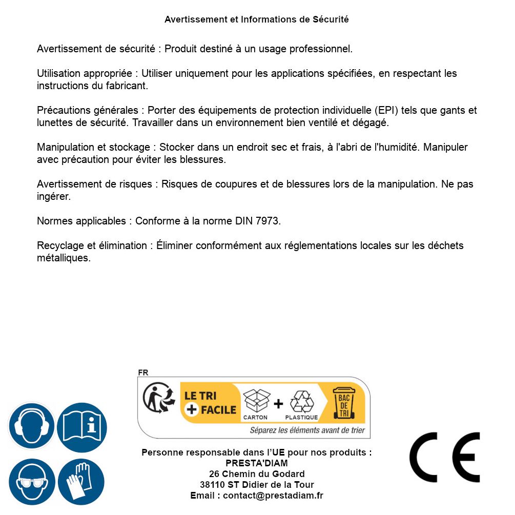 | AVERTISSEMENT et SECURITE | Avertissement de sécurité : Produit destiné à un usage professionnel.Utilisation appropriée : Utiliser uniquement pour le vissage dans des matériaux appropriés.Précautions générales : Porter des équipements de protection individuelle (EPI) tels que des gants et des lunettes de sécurité. Travailler dans un environnement bien éclairé et dégagé.Manipulation et stockage : Conserver dans un endroit sec et frais, à l'abri de l'humidité.Avertissement de risques : Risque de blessures par perforation ou coupure. Ne pas ingérer.Normes applicables : Conforme à la norme DIN 7973.Recyclage et élimination : Éliminer conformément aux réglementations locales sur les déchets métalliques. Identification de la personne responsable dans l’UE : Nom : PRESTA'DIAM. Adresse : 26 Chemin du Godard, 38110 ST Didier de la Tour (France). Email : contact@prestadiam.fr. |