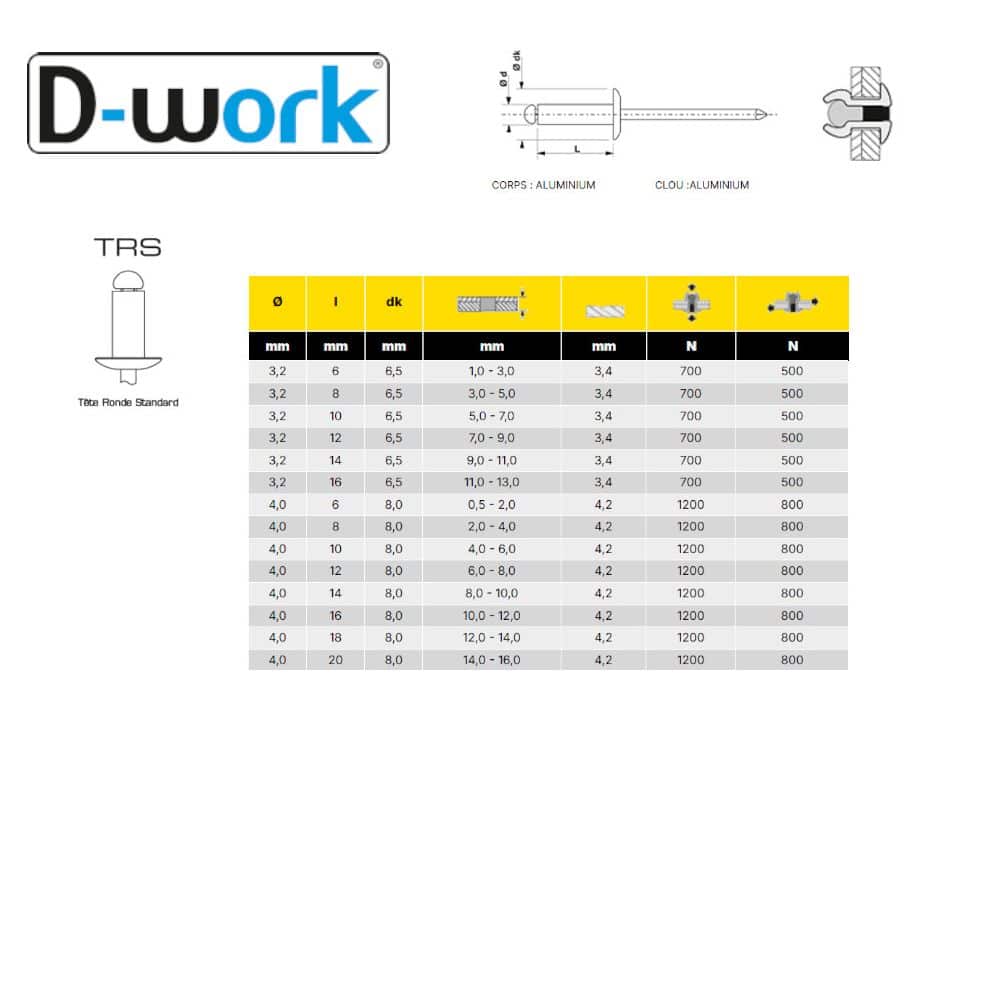 Les 500 rivets aveugles en aluminium/aluminium TR Gorivet TA TRS 4x6 de la marque D-Work sont des éléments de fixation robustes et légers, idéaux pour assembler des matériaux fins ou difficiles d'accès. Leur conception en aluminium assure une excellente résistance à la corrosion tout en offrant une fixation durable et fiable.Caractéristiques principales