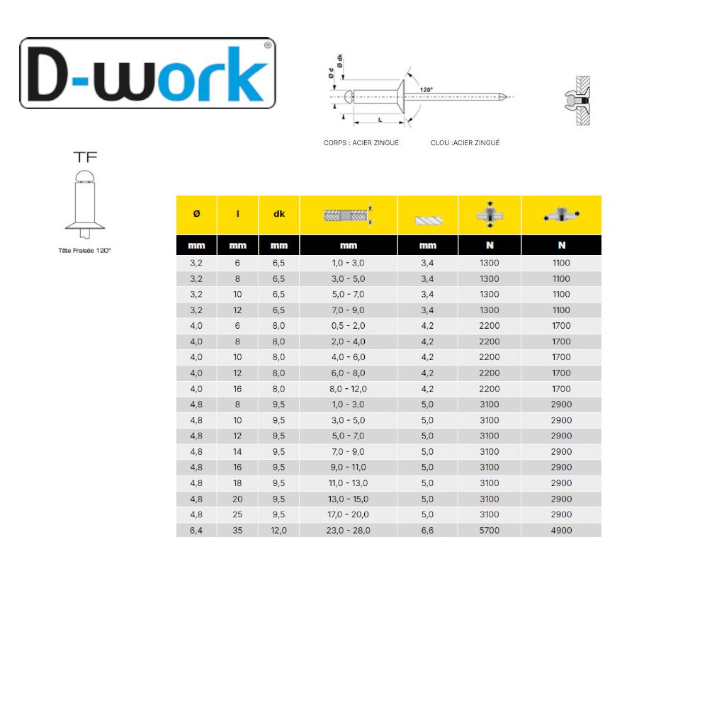 500 Rivets Aveugles Tête Fraisée 120° GORIVET 4 x 8 mm - Acier - D-Work