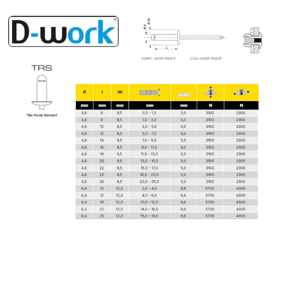 Les rivets aveugles tout acier TR 3.2x14 mm de la marque D-Work sont des éléments de fixation robustes et fiables, conçus pour assembler solidement différents matériaux. Leur conception en acier assure une excellente résistance mécanique et une durabilité accrue, idéale pour les travaux de bricolage, de construction et d'industrie.Caractéristiques principales