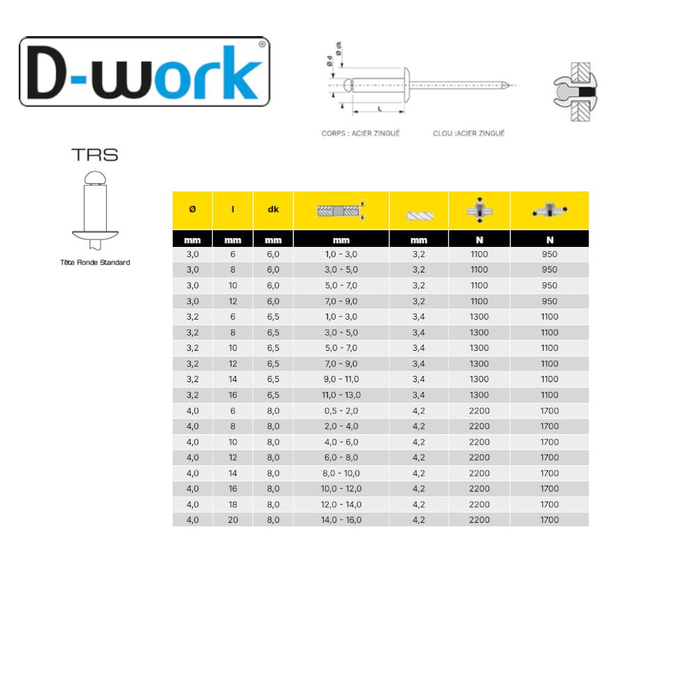 Ref. LEN-6133-4-16En savoir + sur 500 Rivets Aveugles Tête Ronde GORIVET AC TRS 4 x 16 mm - Acier - D-Work