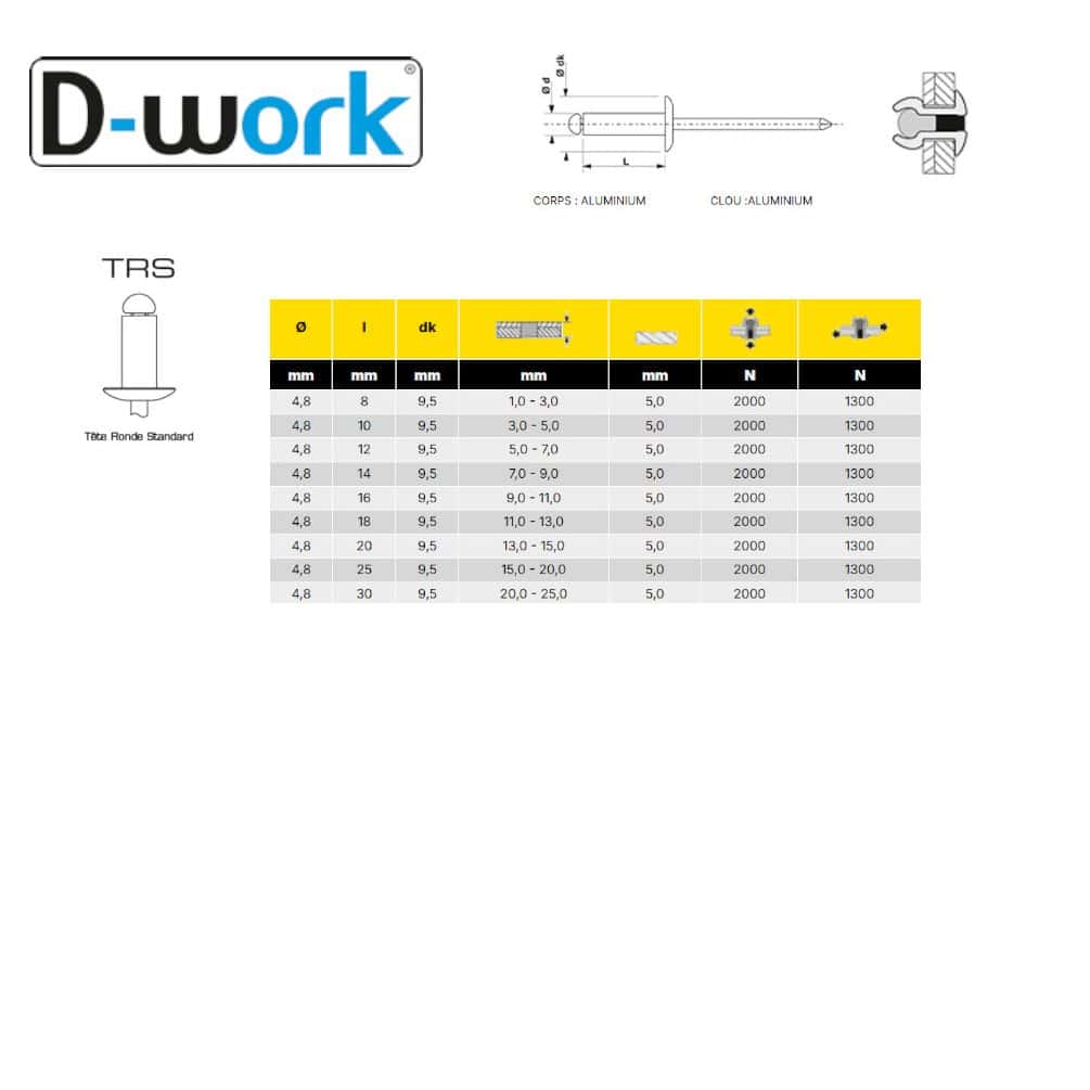 Les rivets aveugles aluminium/aluminium TR 4x8 mm de la marque D-Work sont des fixations robustes et légères, idéales pour assembler des matériaux fins ou difficiles d'accès. Ce lot de 500 pièces offre une solution pratique et économique pour vos travaux de fixation, garantissant une tenue fiable et durable.Caractéristiques principales