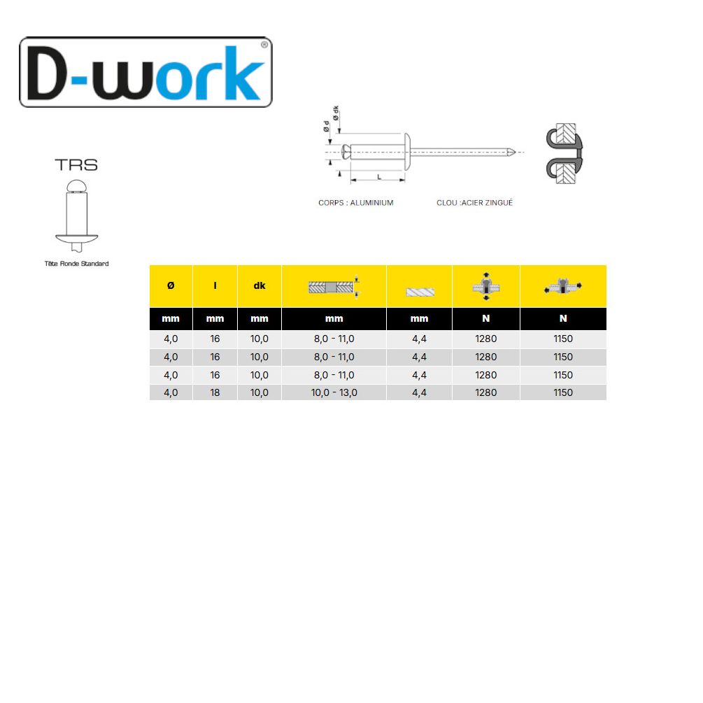 500 Rivets Aveugles Tête Ronde 4 x 6 mm - GORIVET ALX TRS - Aluminium/Acier - D-Work