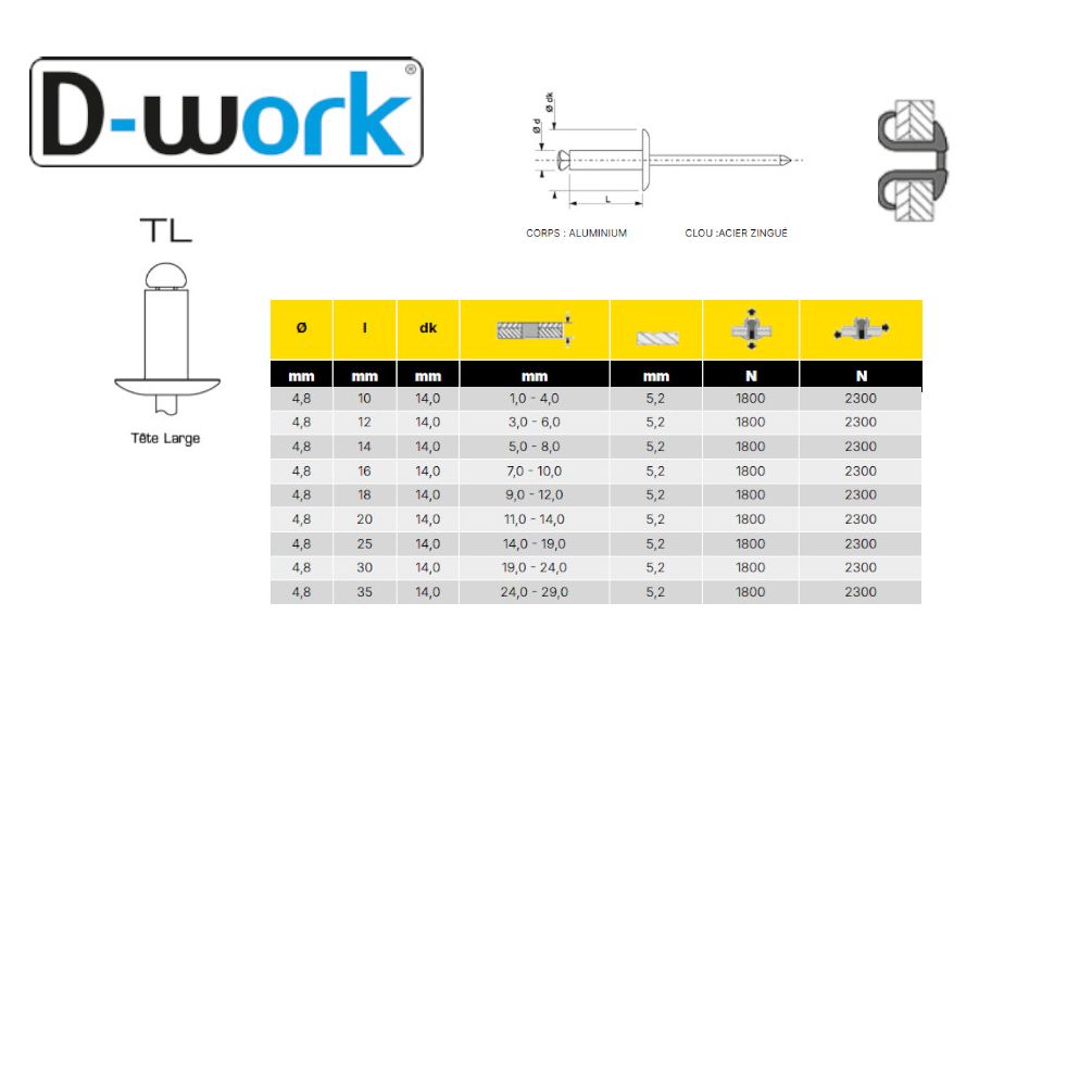 250 Rivets Aveugles Eclatés Tête Large GOSTAR 4.8 x 18 mm - Aluminium/Acier - D-Work