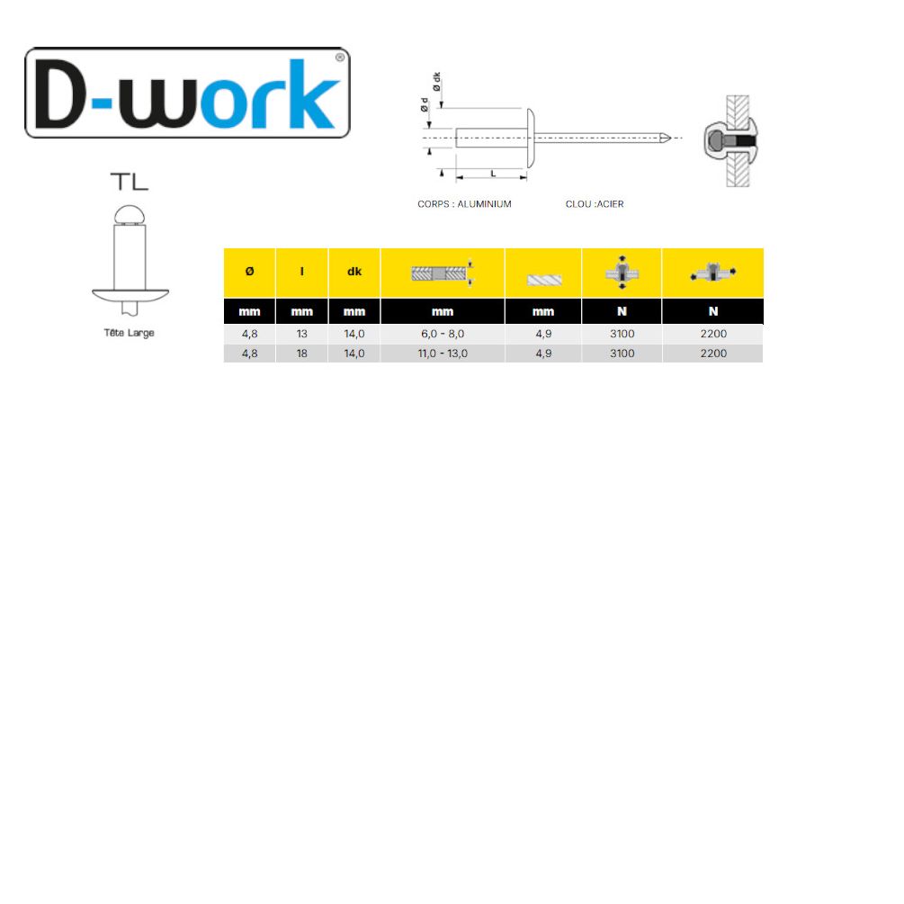 Ref. LEN-6162-4.8-13En savoir + sur 250 Rivets Aveugles Etanches Tête Large GOSTOP AL/AC TL 4.8 x 13 mm - Aluminium/Acier - D-Work