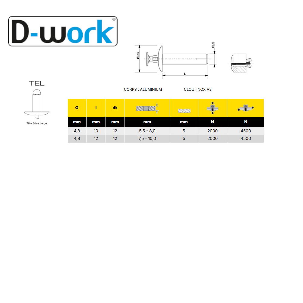 250 Rivets Aveugles Expansés Tête Extra Large GODRIVE MINOX 4.8 x 12 mm - Alu/Inox - D-Work