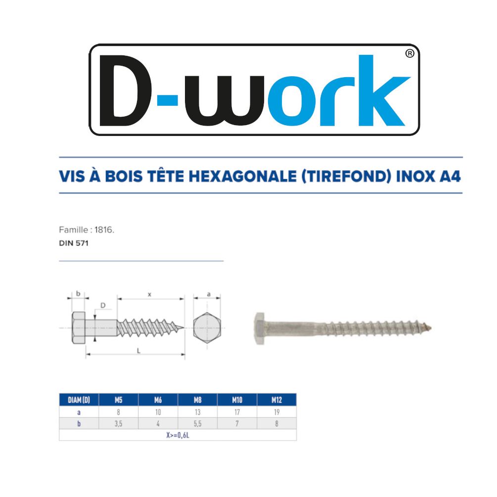 100 Tirefonds Bois Tête Hexagonale 8 x 60 mm - DIN 571 - Inox A2 - D-Work