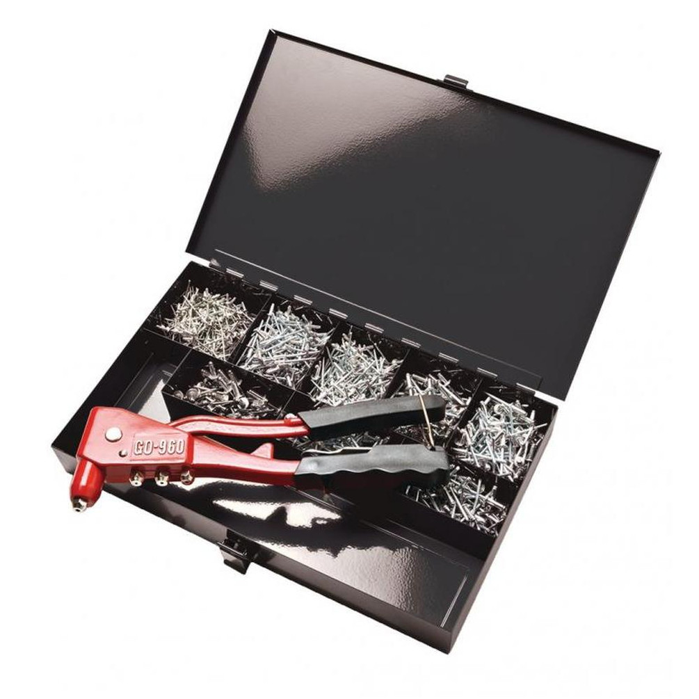 Pour utiliser ce coffret, sélectionnez le rivet adapté à votre application, insérez-le dans la pince GO960, puis positionnez-le sur les pièces à assembler. Serrez la pince jusqu'à ce que le rivet soit correctement fixé. Ce système permet une fixation rapide et sécurisée, idéale pour les assemblages nécessitant solidité et durabilité.