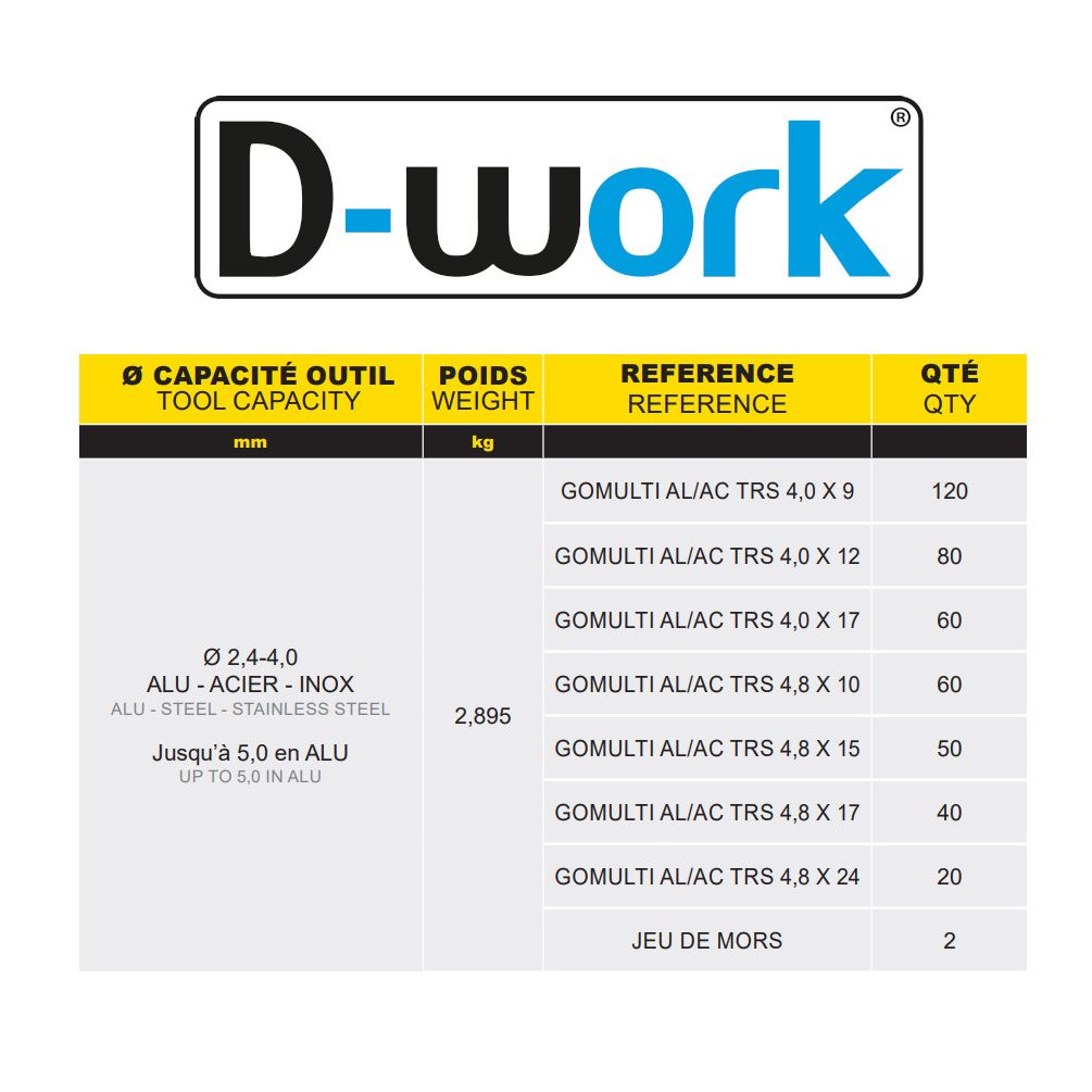 Le coffret D-Work comprend 430 pièces de rivets multiserrage accompagnés de la pince GO960, un outil performant pour une fixation rapide et durable. Ce kit complet est idéal pour les travaux de fixation dans le bâtiment, la menuiserie et la réparation industrielle. La pince GO960 assure une prise en main confortable et une utilisation efficace des rivets multiserrage, garantissant une fixation solide sur divers matériaux.