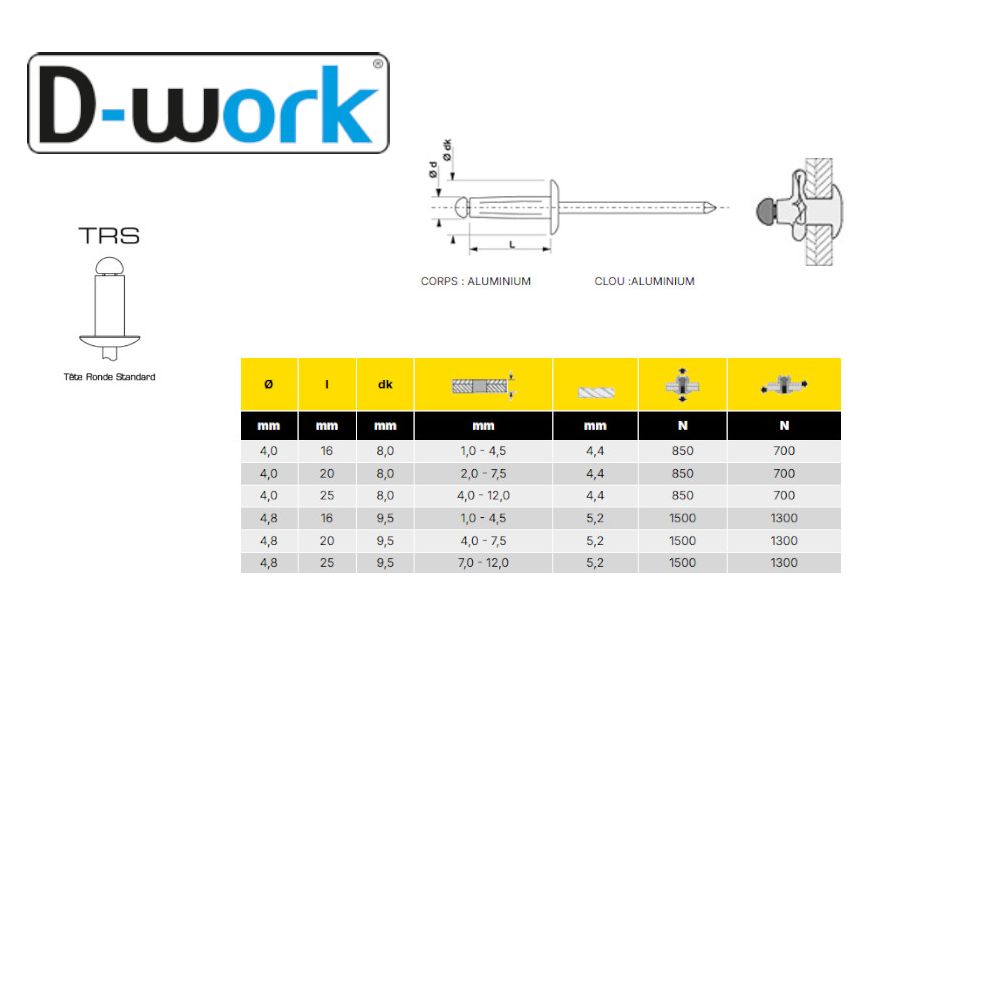 500 Rivets Aveugles Tête Ronde 4 x 6 mm - GORIVET ALX TRS - Aluminium/Acier - D-Work