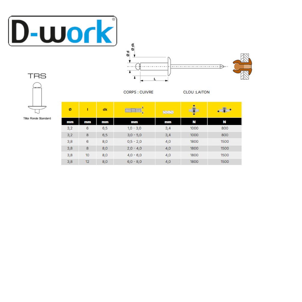 Ref. LEN-6139-4-10En savoir + sur 500 Rivets Aveugles Tête Ronde GORIVET TRS 4 x 10 mm - Cuivre/Laiton - D-Work