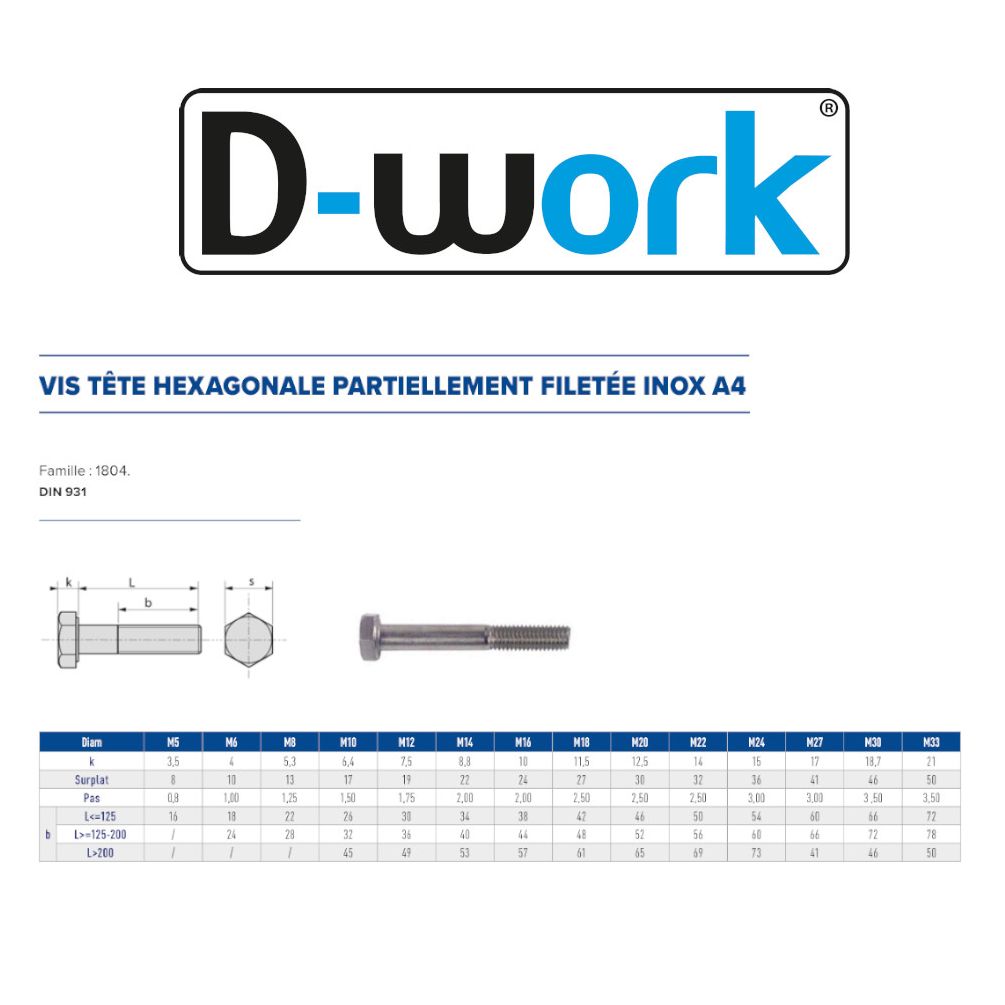 5 Vis Métaux Tête Hexagonale F/Partiel 27 x 250 mm - DIN 931 - Inox A4 - D-Work
