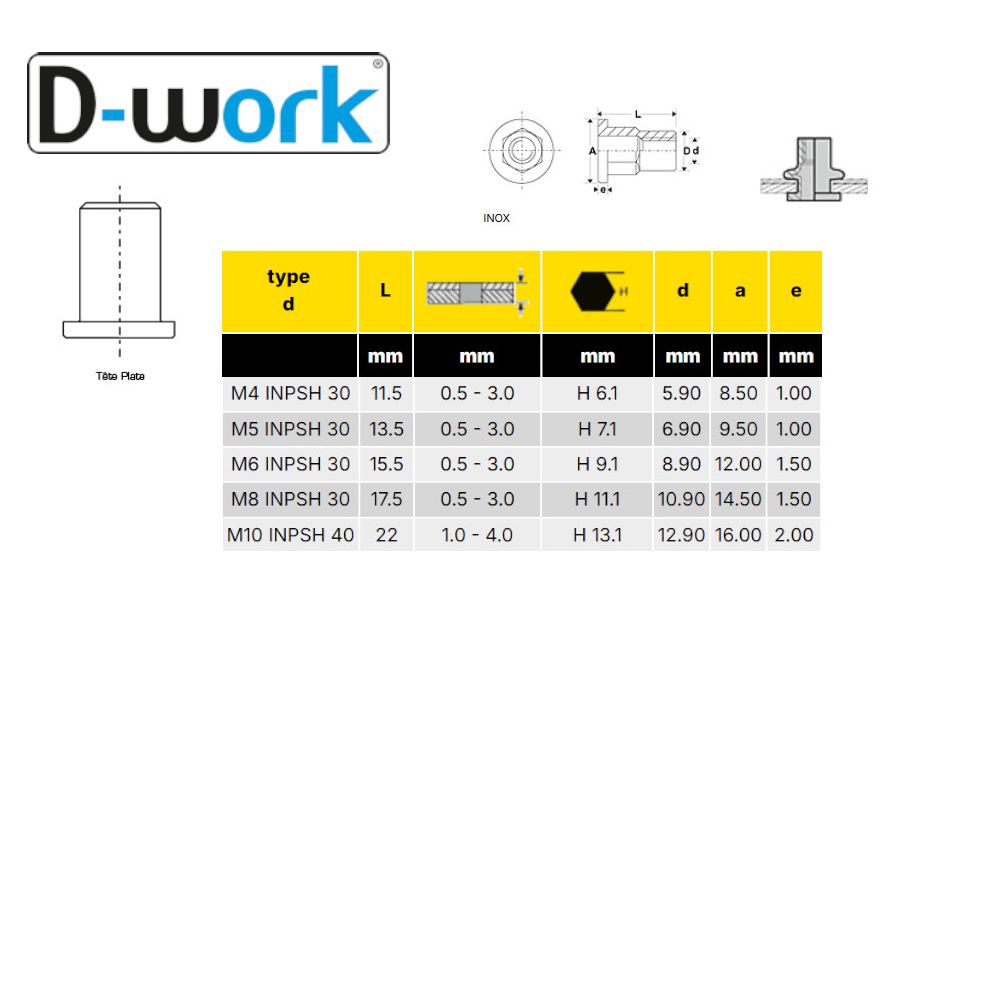 Ref. LEN-6188-10-22En savoir + sur 100 Ecrous à Sertir Semi Hexagonaux Tête Plate GOFIX M10 x 22 mm - Inox - D-Work
