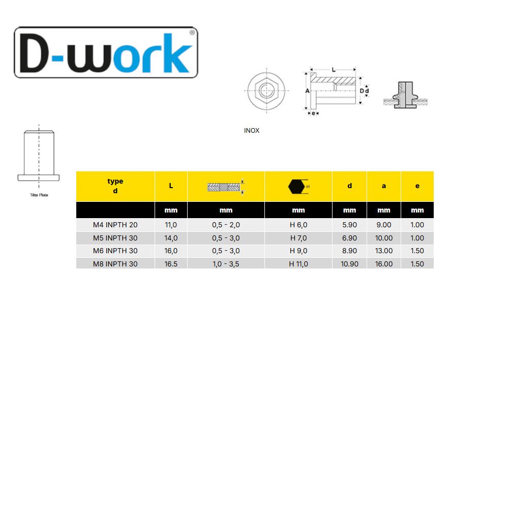 Ref. LEN-6189-6-16En savoir + sur 250 Ecrous à Sertir Hexagonaux Tête Plate GOFIX M6 x 16 mm - Inox - D-Work