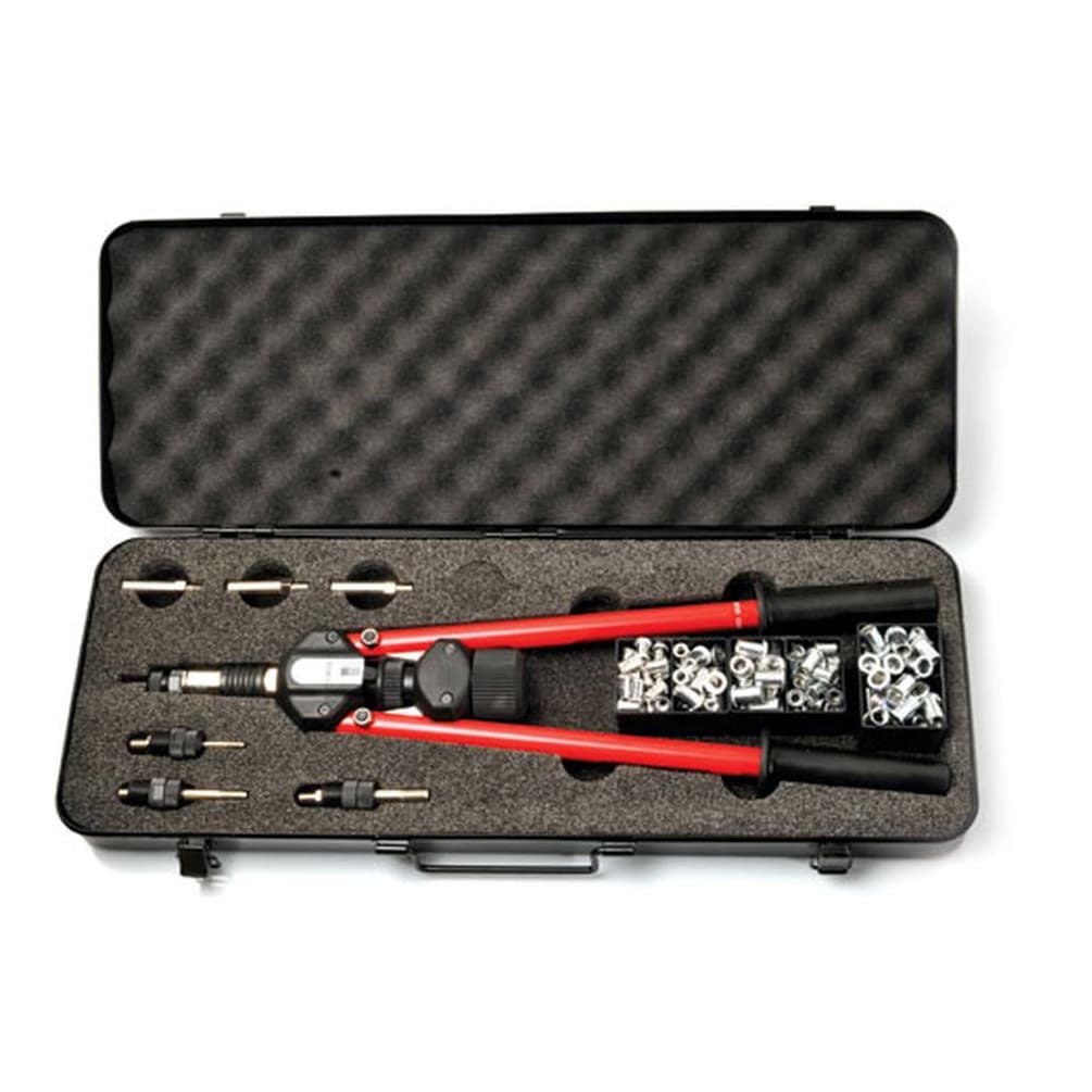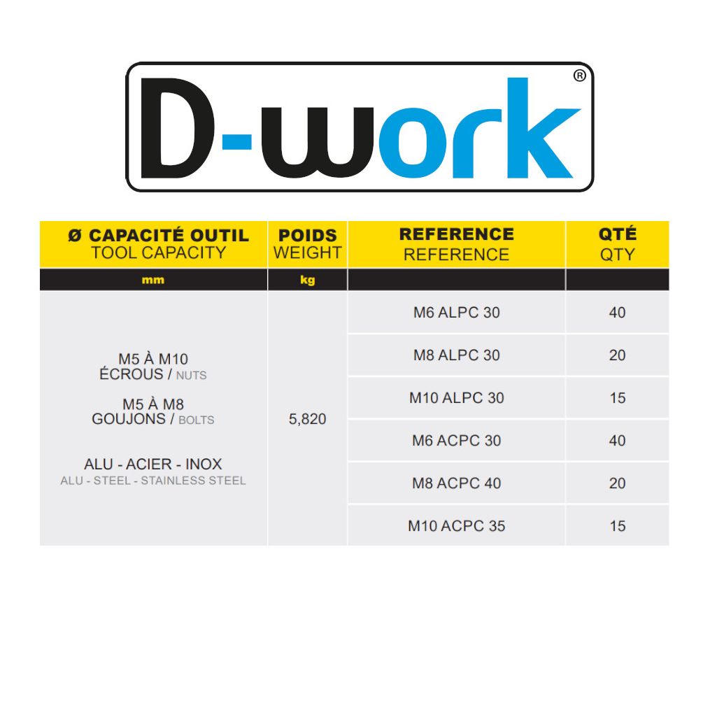 Le coffret D-Work comprend 150 écrous à sertir accompagnés de la pince GO6110, un ensemble complet pour réaliser des fixations solides et rapides. Ce kit est idéal pour les professionnels et les bricoleurs souhaitant une solution efficace pour assembler des pièces métalliques sans soudure.