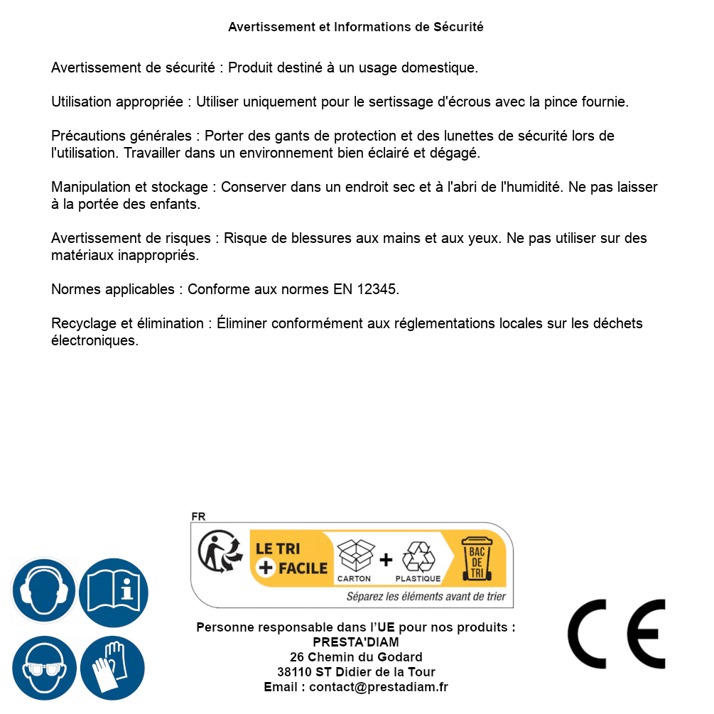 | AVERTISSEMENT et SECURITE | Avertissement de sécurité : Produit destiné à un usage domestique.Utilisation appropriée : Utiliser uniquement pour le sertissage d'écrous avec la pince fournie.Précautions générales : Porter des gants de protection et des lunettes de sécurité lors de l'utilisation. Travailler dans un environnement bien éclairé et dégagé.Manipulation et stockage : Conserver dans un endroit sec et à l'abri de l'humidité. Ne pas laisser à la portée des enfants.Avertissement de risques : Risque de blessures aux mains et aux yeux. Ne pas utiliser sur des matériaux inappropriés.Normes applicables : Conforme aux normes EN 12345.Recyclage et élimination : Éliminer conformément aux réglementations locales sur les déchets électroniques. Identification de la personne responsable dans l’UE : Nom : PRESTA'DIAM. Adresse : 26 Chemin du Godard, 38110 ST Didier de la Tour (France). Email : contact@prestadiam.fr. |