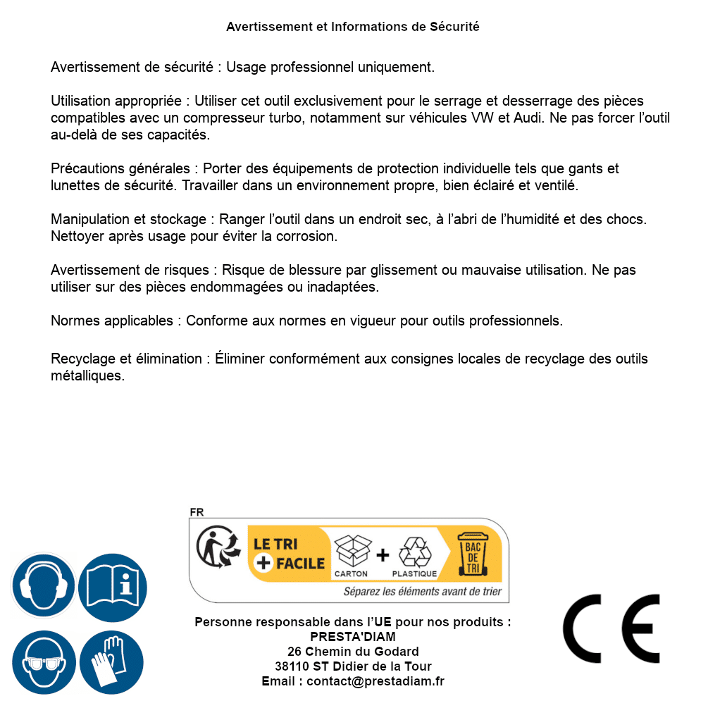 | AVERTISSEMENT et SECURITE | Identification de la personne responsable dans l’UE : Nom : PRESTA'DIAM. Adresse : 26 Chemin du Godard, 38110 ST Didier de la Tour (France). Email : contact@prestadiam.fr. |