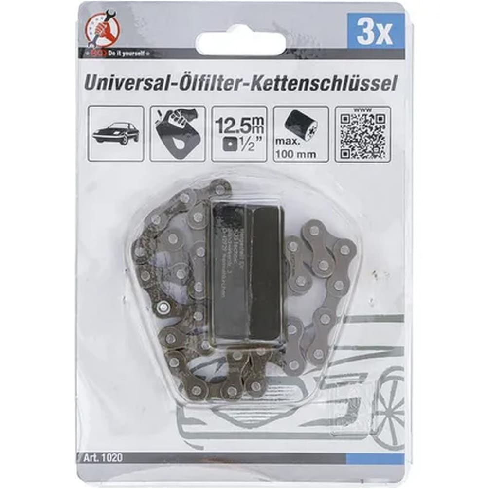 La Clé à Filtre d'Huile Universelle à Chaîne BGS est un outil indispensable pour les professionnels et les amateurs de mécanique. Conçue pour s'adapter à une large gamme de filtres d'huile, elle offre une prise sûre et efficace grâce à sa chaîne robuste de 12,5 mm (1/2") et une longueur totale de 100 mm. Cet outil facilite le démontage et le montage des filtres, même dans les espaces restreints.