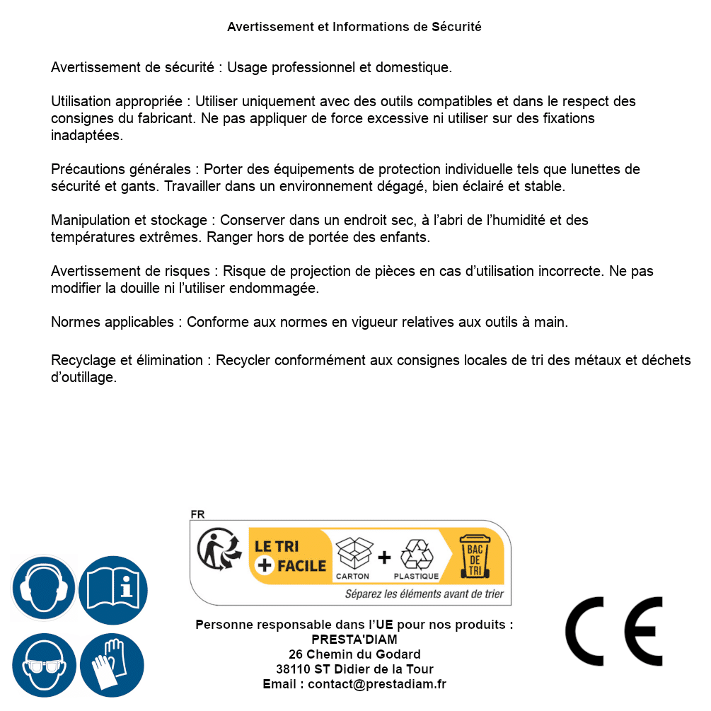 | AVERTISSEMENT et SECURITE | Identification de la personne responsable dans l’UE : Nom : PRESTA'DIAM. Adresse : 26 Chemin du Godard, 38110 ST Didier de la Tour (France). Email : contact@prestadiam.fr. |