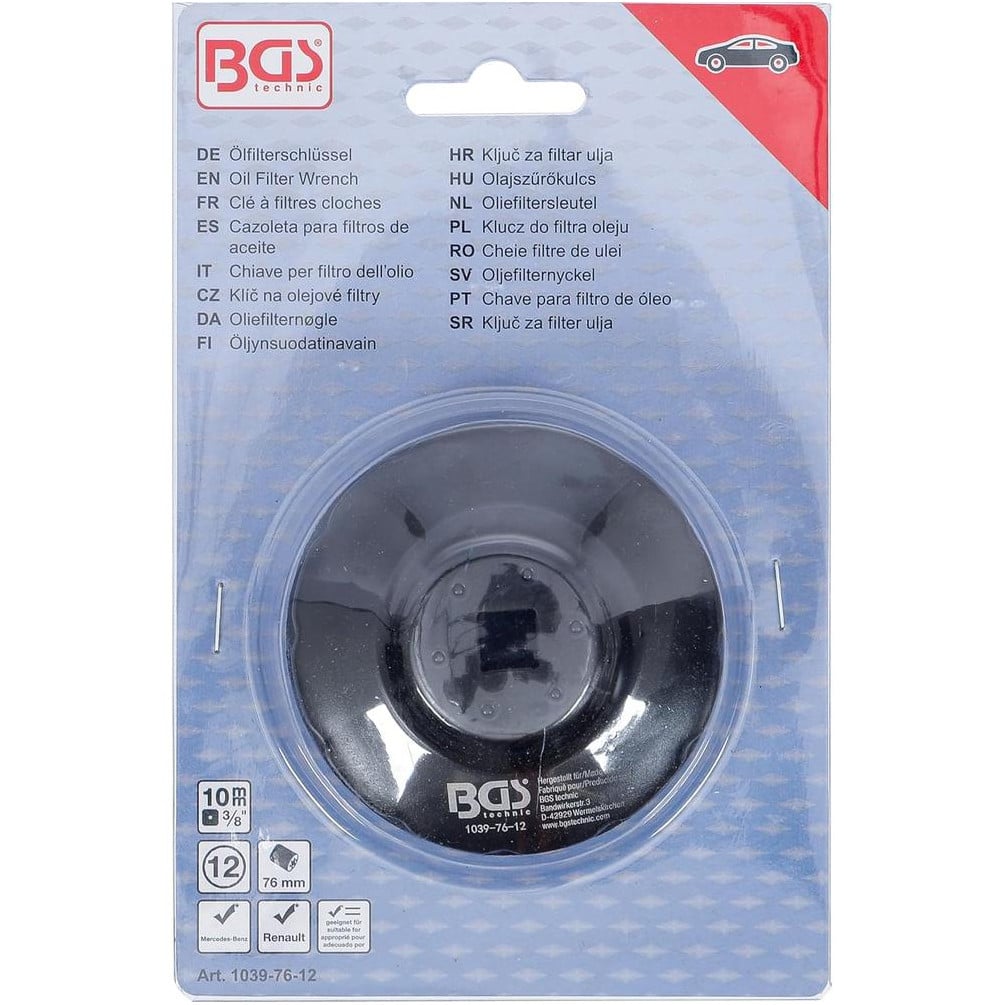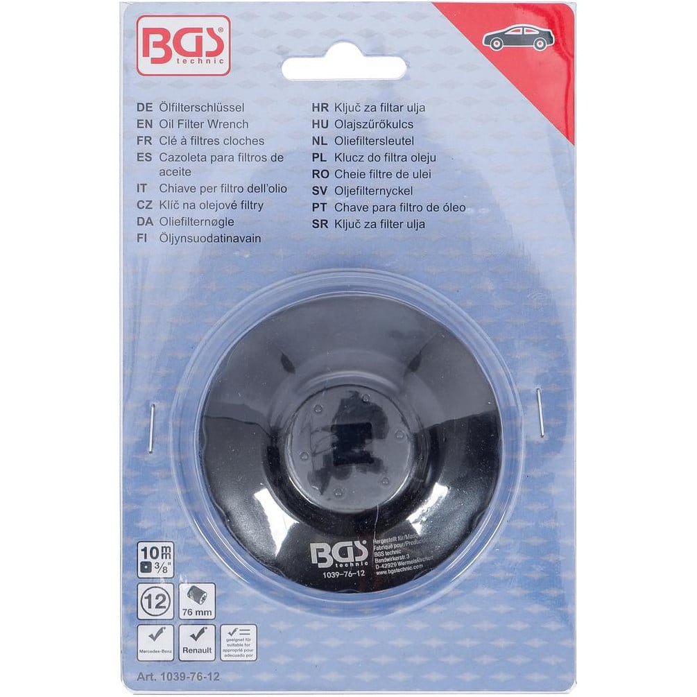 La Clé à Filtres Cloches 12 Pans de 76 mm est un outil professionnel conçu pour faciliter le démontage et le montage des filtres à huile sur véhicules Fiat, Mercedes-Benz et Renault. Fabriquée par BGS, cette clé assure une prise précise et sécurisée grâce à sa forme douze pans, adaptée aux filtres standards de 76 mm de diamètre.Caractéristiques principales