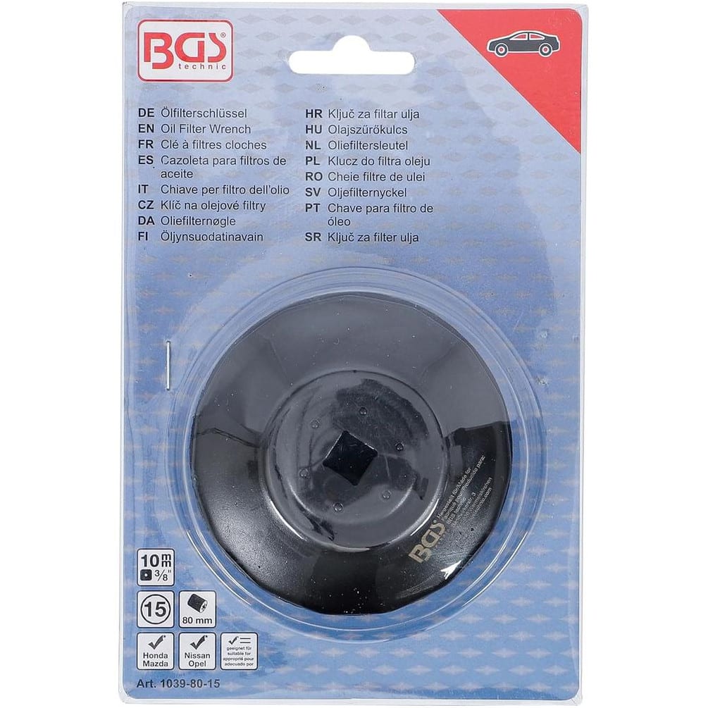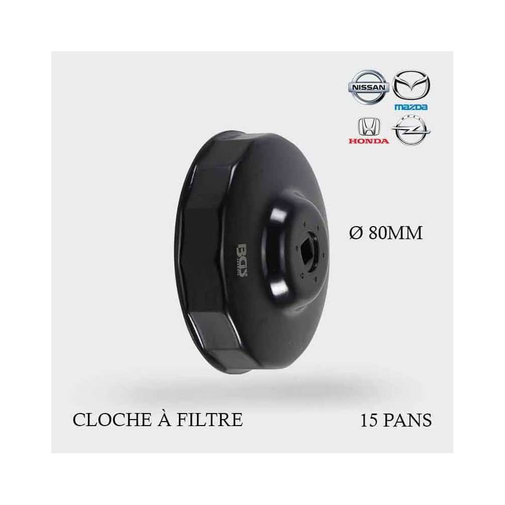 La Clé à Filtres Cloches 15 Pans Ø80 mm de la marque BGS est un outil indispensable pour le démontage et le montage des filtres à huile sur véhicules Honda, Mazda, Nissan et Opel. Conçue pour offrir une prise précise et sécurisée, cette clé facilite l'entretien automobile en garantissant un travail rapide et efficace.Caractéristiques principales