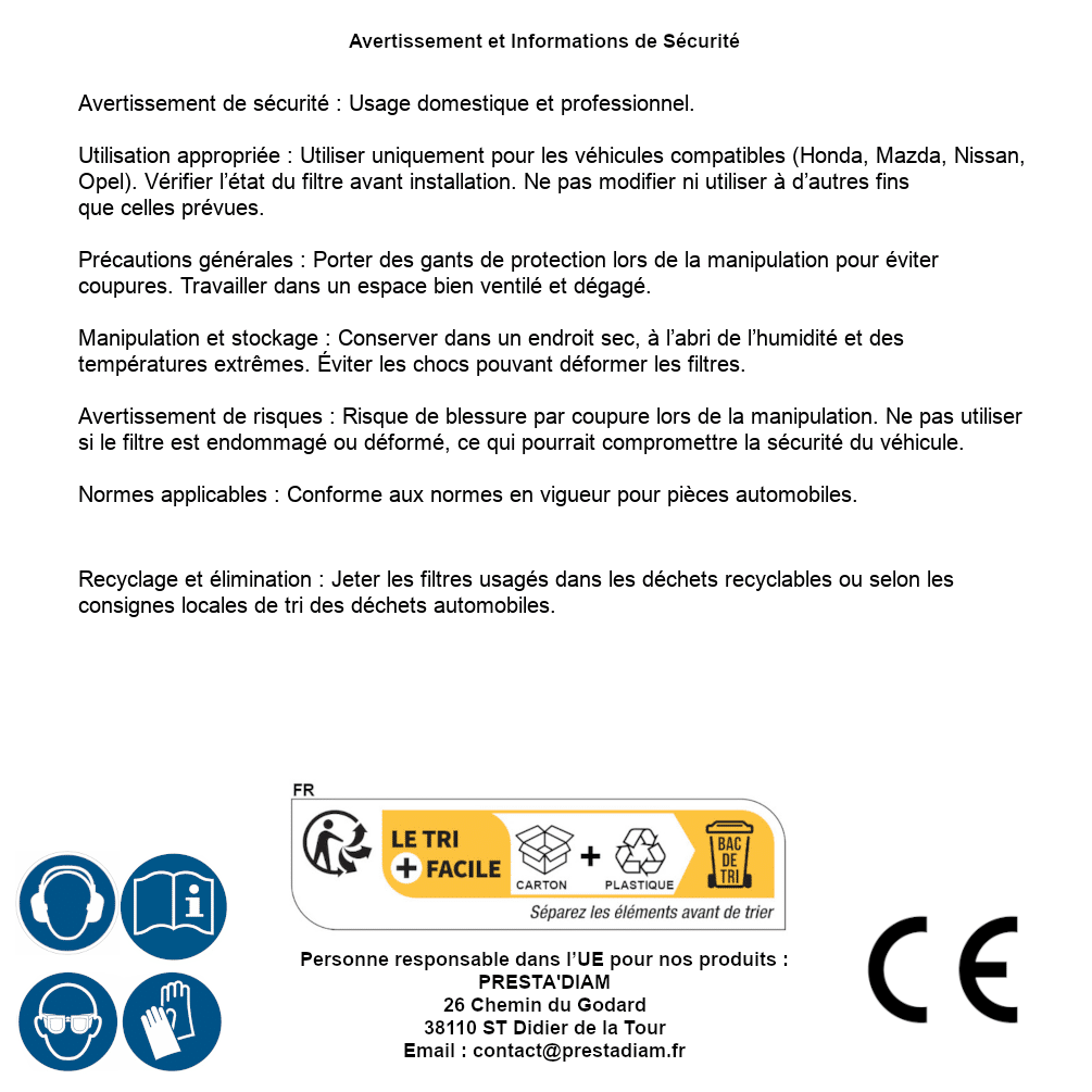 | AVERTISSEMENT et SECURITE | Identification de la personne responsable dans l’UE : Nom : PRESTA'DIAM. Adresse : 26 Chemin du Godard, 38110 ST Didier de la Tour (France). Email : contact@prestadiam.fr. |
