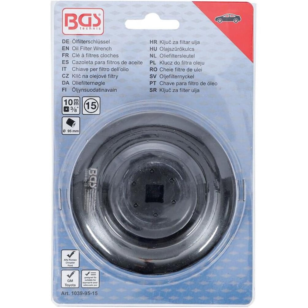 La Clé à Filtres Cloches 15 Pans Ø95 mm de la marque BGS est un outil indispensable pour le démontage et le montage des filtres à huile sur plusieurs modèles de véhicules, notamment Alfa Romeo, Chrysler, Ford, GM et Toyota. Conçue pour offrir une prise sûre et efficace, cette clé facilite l'entretien automobile en garantissant un travail rapide et sans endommager les filtres.Caractéristiques principales