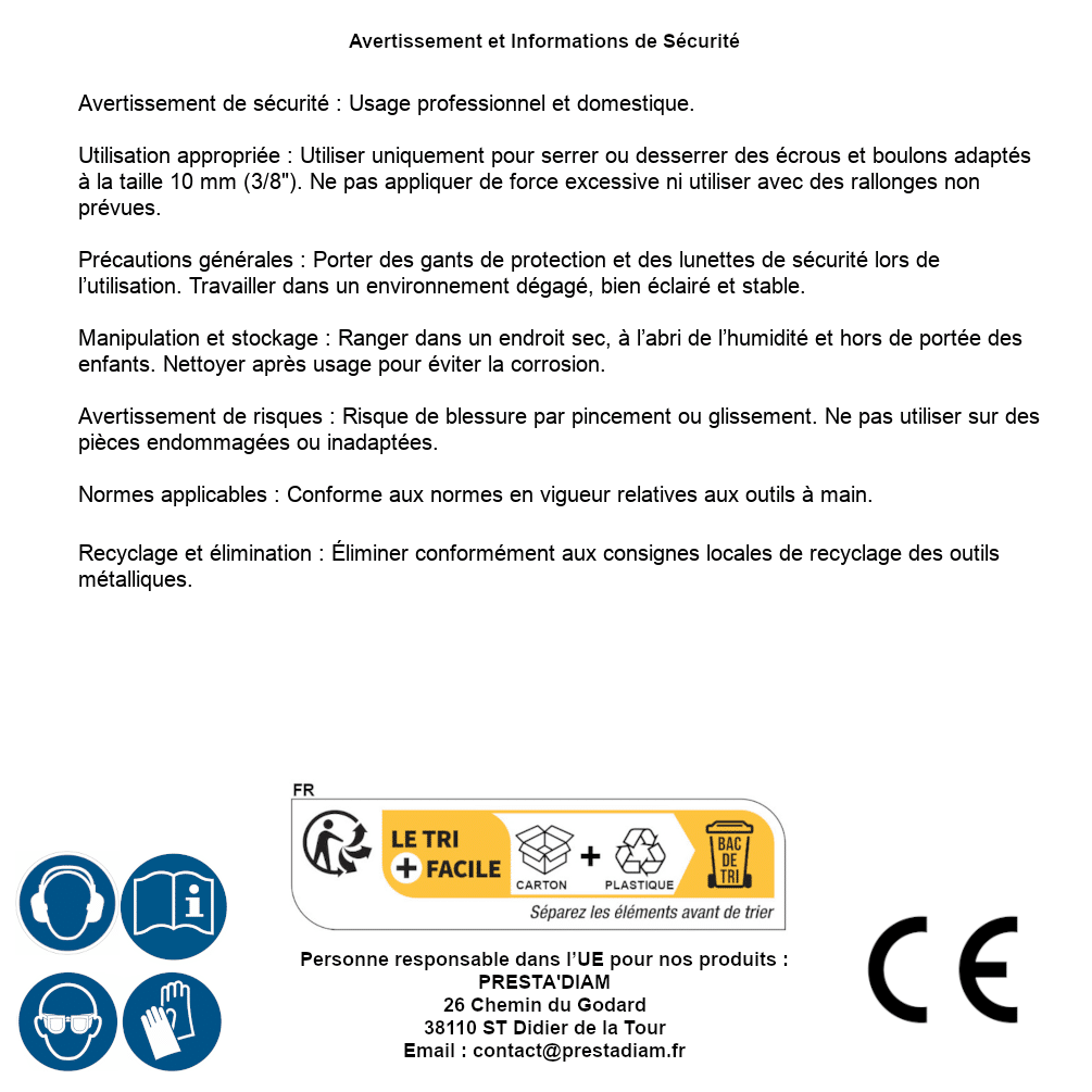 | AVERTISSEMENT et SECURITE | Identification de la personne responsable dans l’UE : Nom : PRESTA'DIAM. Adresse : 26 Chemin du Godard, 38110 ST Didier de la Tour (France). Email : contact@prestadiam.fr. |