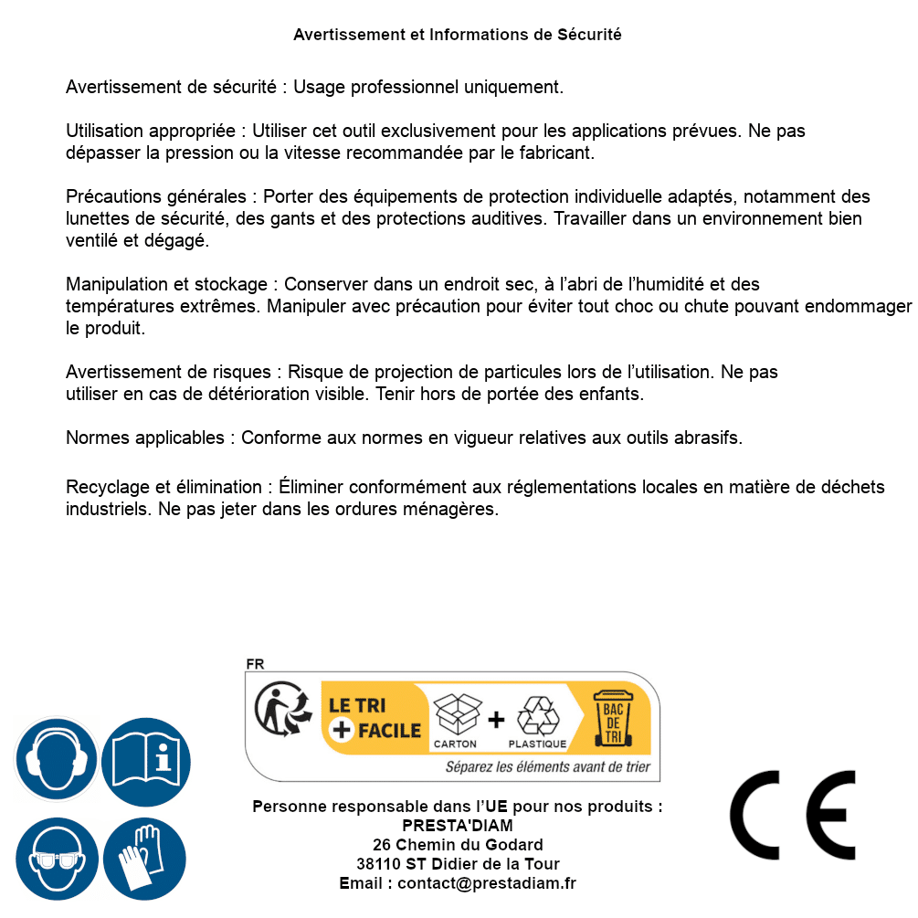 | AVERTISSEMENT et SECURITE | Identification de la personne responsable dans l’UE : Nom : PRESTA'DIAM. Adresse : 26 Chemin du Godard, 38110 ST Didier de la Tour (France). Email : contact@prestadiam.fr. |