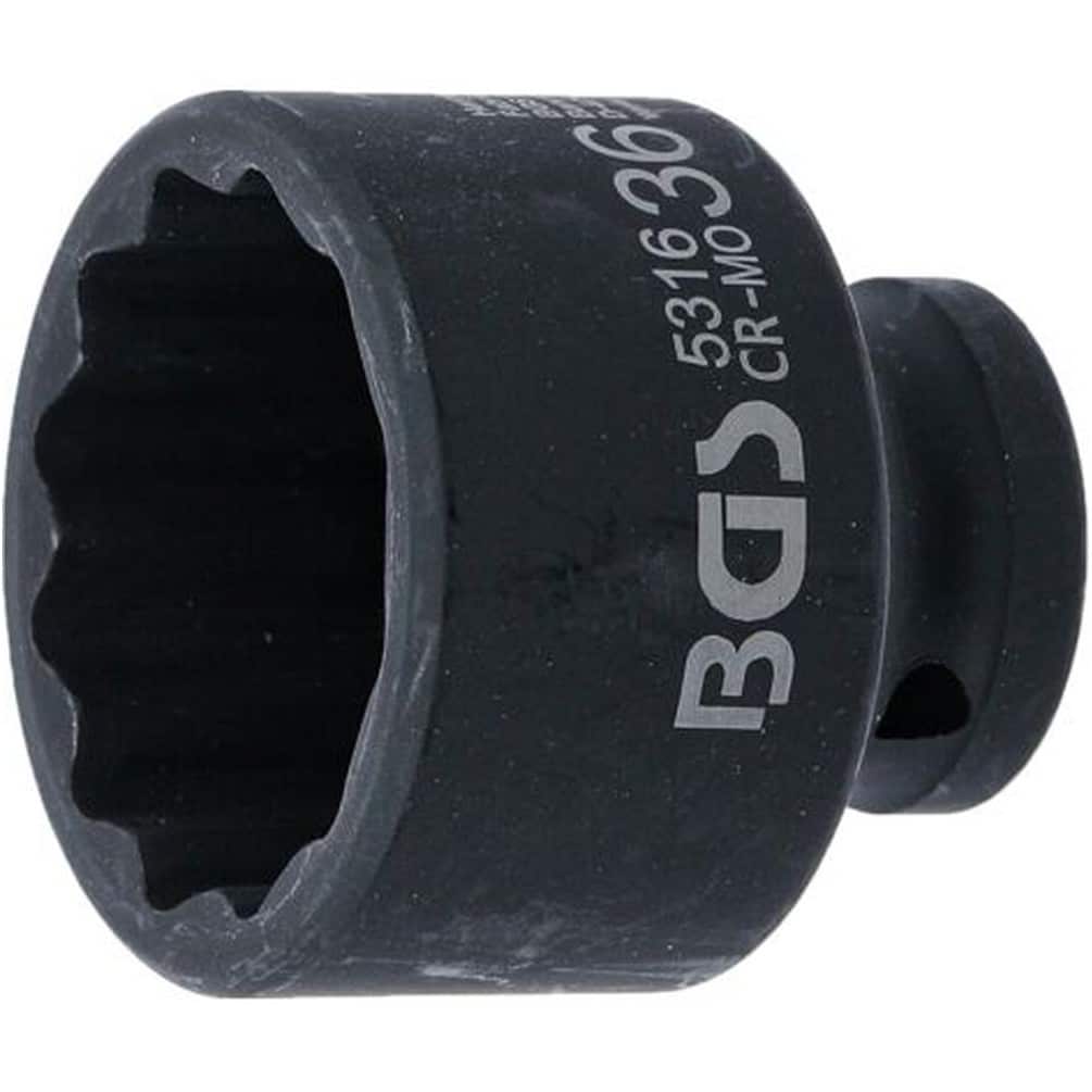 La Douille pour Clé Douze Pans 12,5 mm (1/2") 36 mm de la marque BGS est un outil robuste et précis conçu pour les travaux de serrage et desserrage nécessitant une prise fiable sur les écrous et boulons. Fabriquée en acier de haute qualité, cette douille assure une excellente résistance à l'usure et une longue durée de vie.Caractéristiques principales