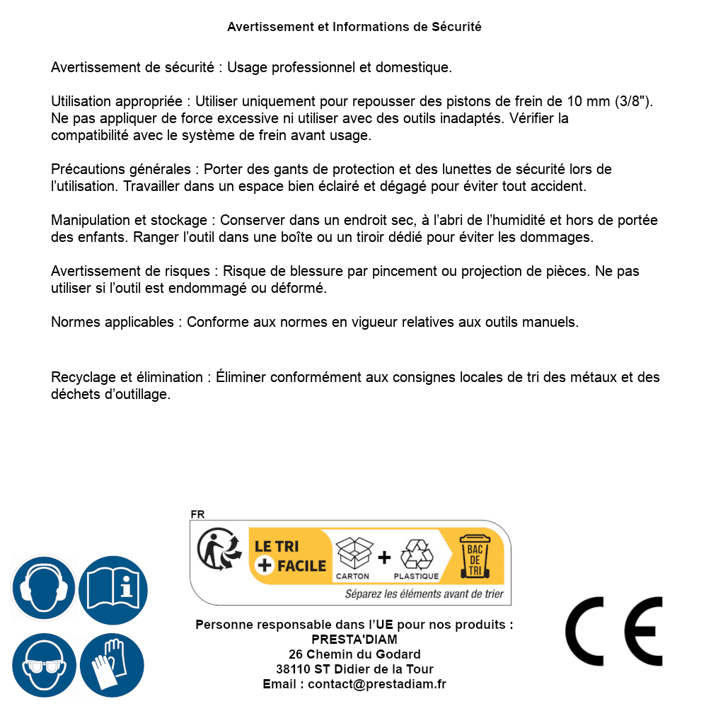 | AVERTISSEMENT et SECURITE | Identification de la personne responsable dans l’UE : Nom : PRESTA'DIAM. Adresse : 26 Chemin du Godard, 38110 ST Didier de la Tour (France). Email : contact@prestadiam.fr. |