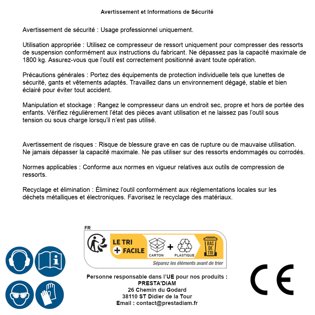 | AVERTISSEMENT et SECURITE | Identification de la personne responsable dans l’UE : Nom : PRESTA'DIAM. Adresse : 26 Chemin du Godard, 38110 ST Didier de la Tour (France). Email : contact@prestadiam.fr. |