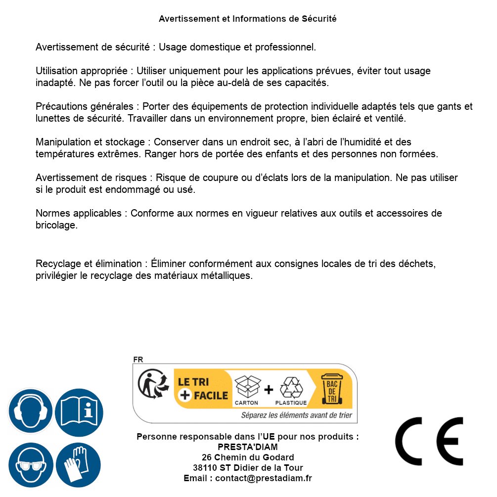 | AVERTISSEMENT et SECURITE | Identification de la personne responsable dans l’UE : Nom : PRESTA'DIAM. Adresse : 26 Chemin du Godard, 38110 ST Didier de la Tour (France). Email : contact@prestadiam.fr. |