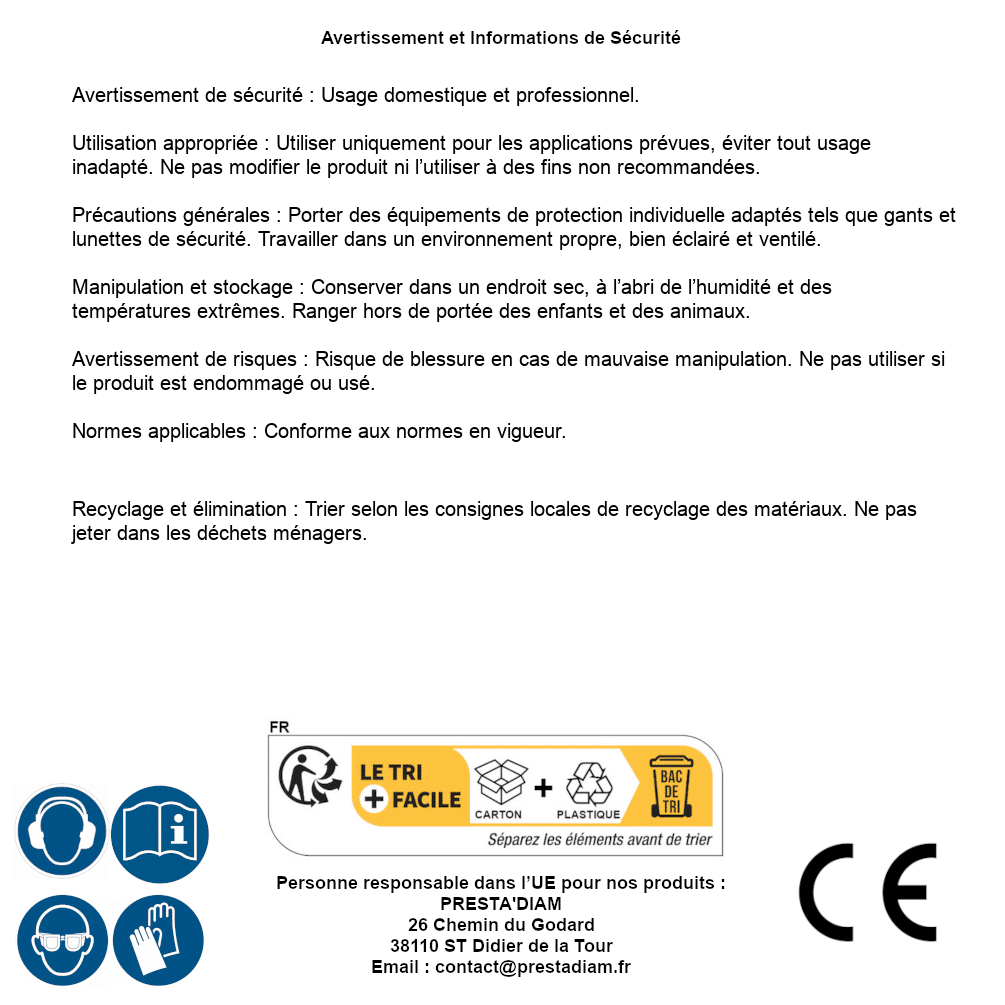 | AVERTISSEMENT et SECURITE | Identification de la personne responsable dans l’UE : Nom : PRESTA'DIAM. Adresse : 26 Chemin du Godard, 38110 ST Didier de la Tour (France). Email : contact@prestadiam.fr. |