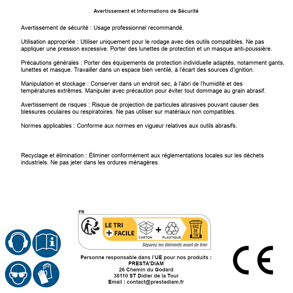 | AVERTISSEMENT et SECURITE | Identification de la personne responsable dans l’UE : Nom : PRESTA'DIAM. Adresse : 26 Chemin du Godard, 38110 ST Didier de la Tour (France). Email : contact@prestadiam.fr. |