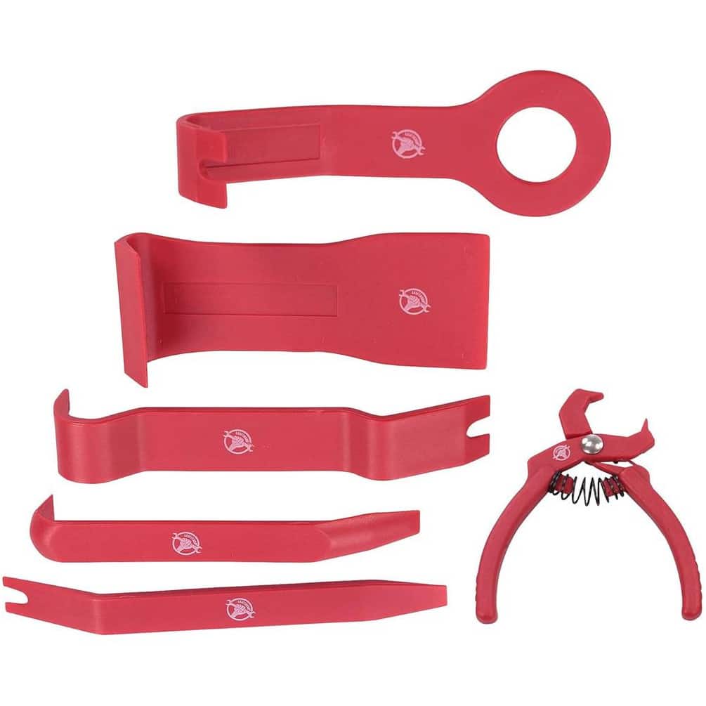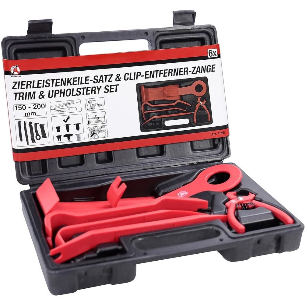 Le jeu de coins pour garnitures BGS comprend 6 pièces aux formes diverses, accompagné d'une pince spécialement conçue pour dégarnir les agrafes. Cet ensemble est idéal pour les travaux de garniture automobile, tapisserie ou tout autre travail nécessitant précision et efficacité dans la manipulation des agrafes et garnitures.