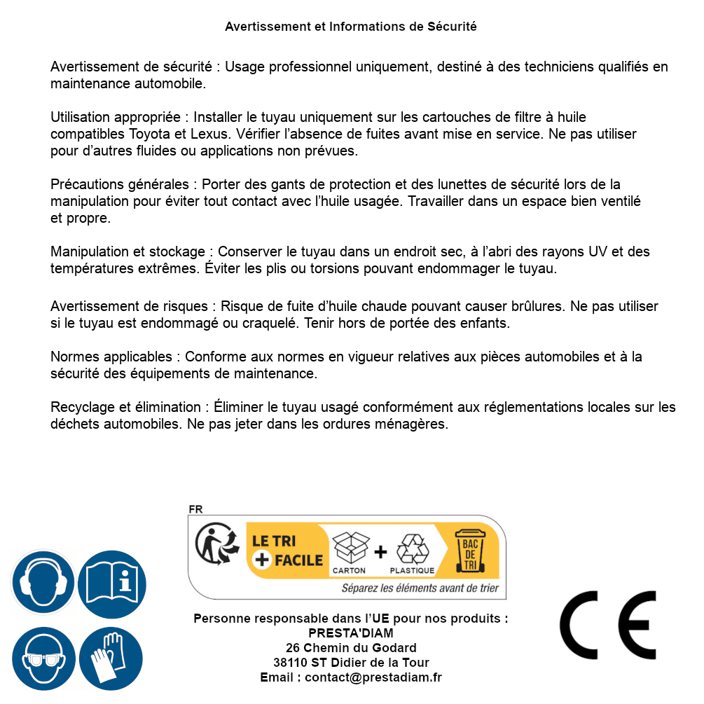 | AVERTISSEMENT et SECURITE | Identification de la personne responsable dans l’UE : Nom : PRESTA'DIAM. Adresse : 26 Chemin du Godard, 38110 ST Didier de la Tour (France). Email : contact@prestadiam.fr. |