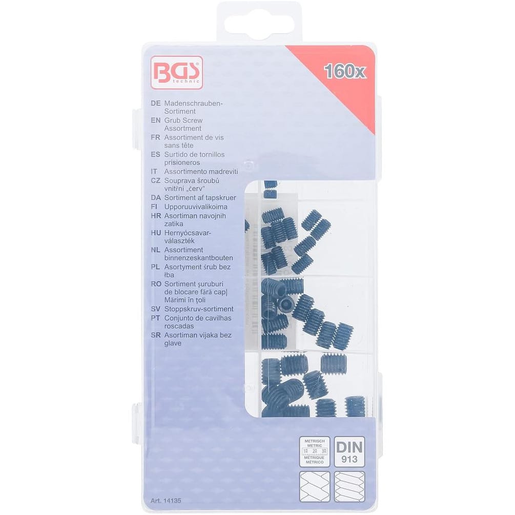 Découvrez cet assortiment de 160 vis sans tête de la marque BGS, idéal pour vos travaux de fixation et assemblage. Fabriquées en acier, ces vis offrent une excellente résistance mécanique et une grande durabilité. Leur conception sans tête permet une fixation discrète et sécurisée dans divers matériaux.Caractéristiques principales