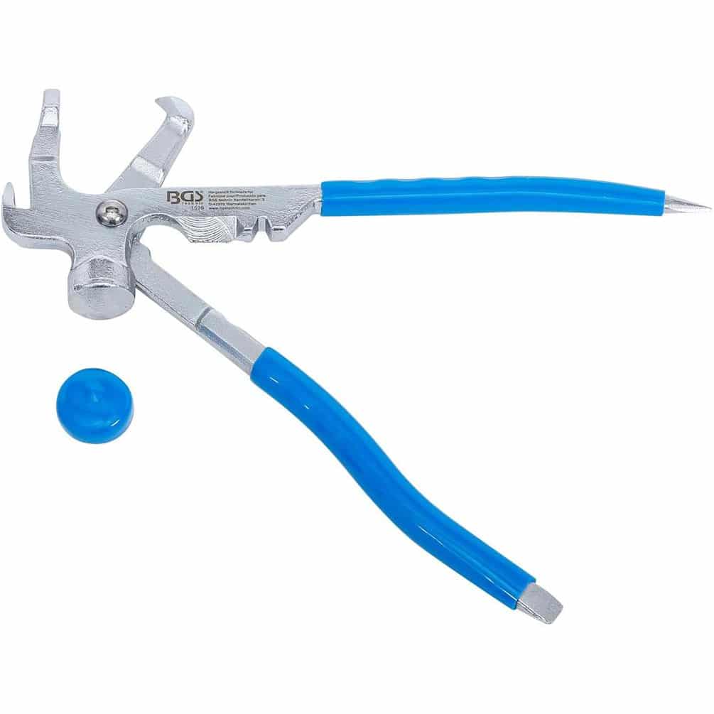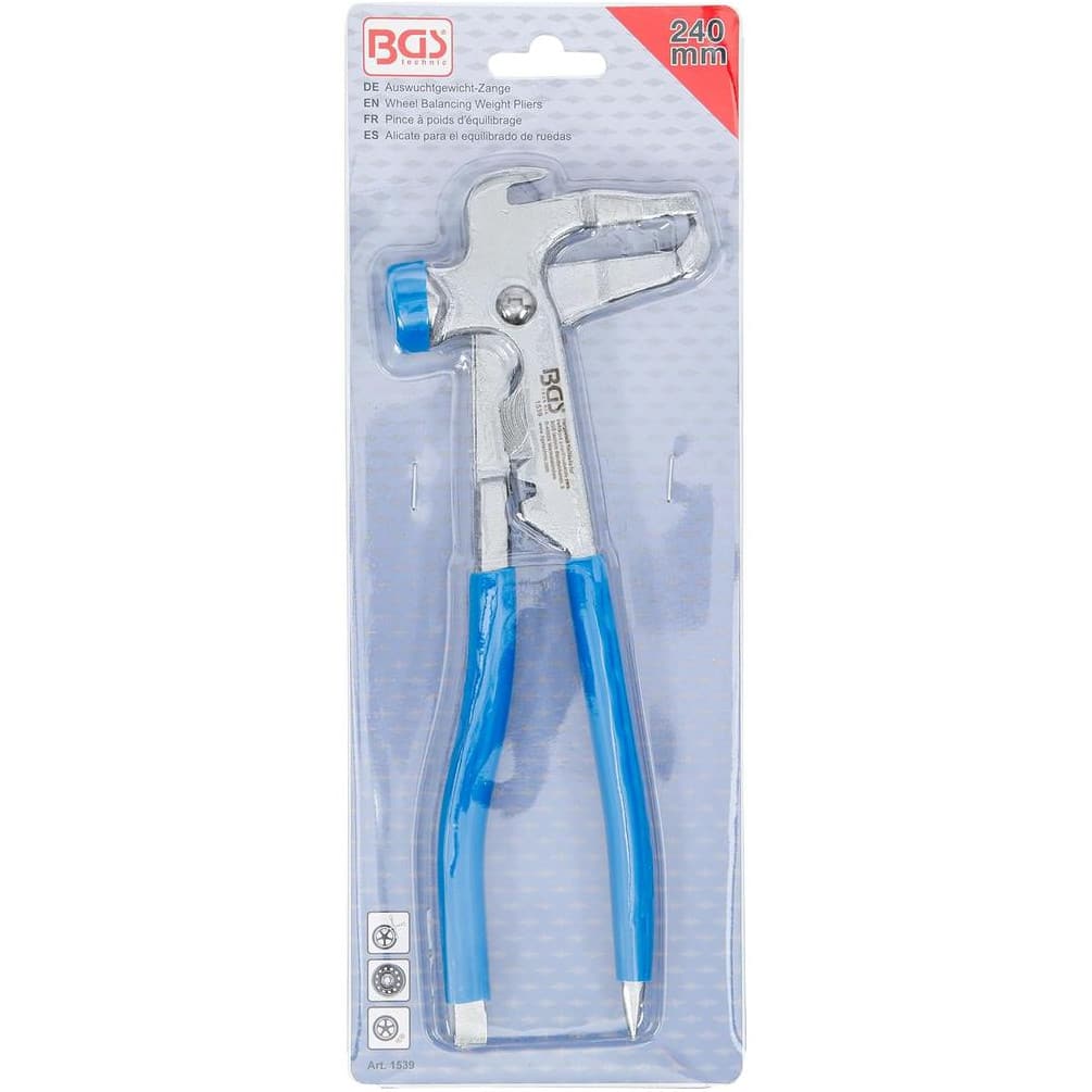 La pince à poids d'équilibrage BGS de 240 mm est un outil professionnel conçu pour faciliter la pose et le retrait des poids d'équilibrage sur les jantes de véhicules. Sa conception ergonomique assure une prise en main confortable et une manipulation précise, indispensable pour les travaux de maintenance automobile.