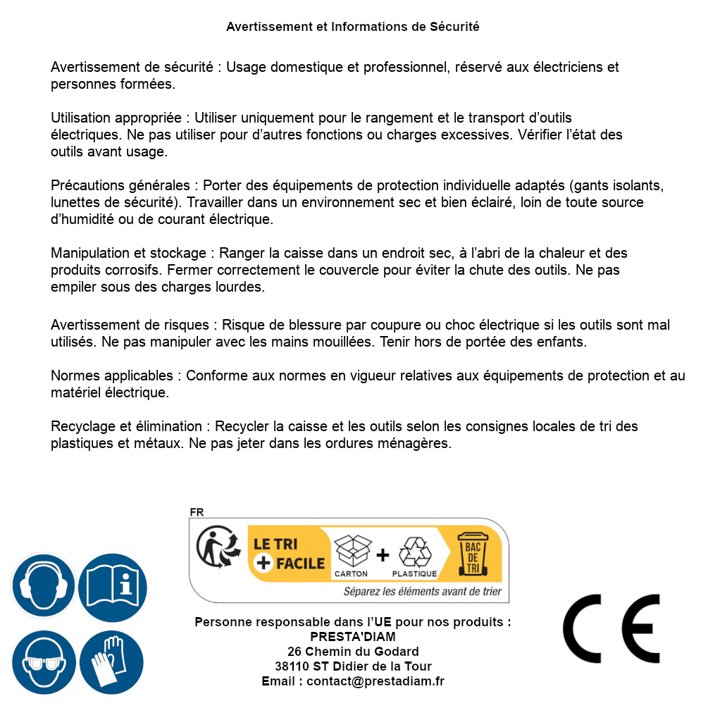 | AVERTISSEMENT et SECURITE | Identification de la personne responsable dans l’UE : Nom : PRESTA'DIAM. Adresse : 26 Chemin du Godard, 38110 ST Didier de la Tour (France). Email : contact@prestadiam.fr. |