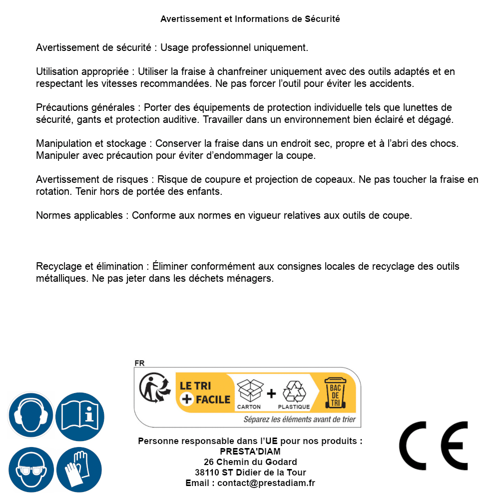 | AVERTISSEMENT et SECURITE | Identification de la personne responsable dans l’UE : Nom : PRESTA'DIAM. Adresse : 26 Chemin du Godard, 38110 ST Didier de la Tour (France). Email : contact@prestadiam.fr. |