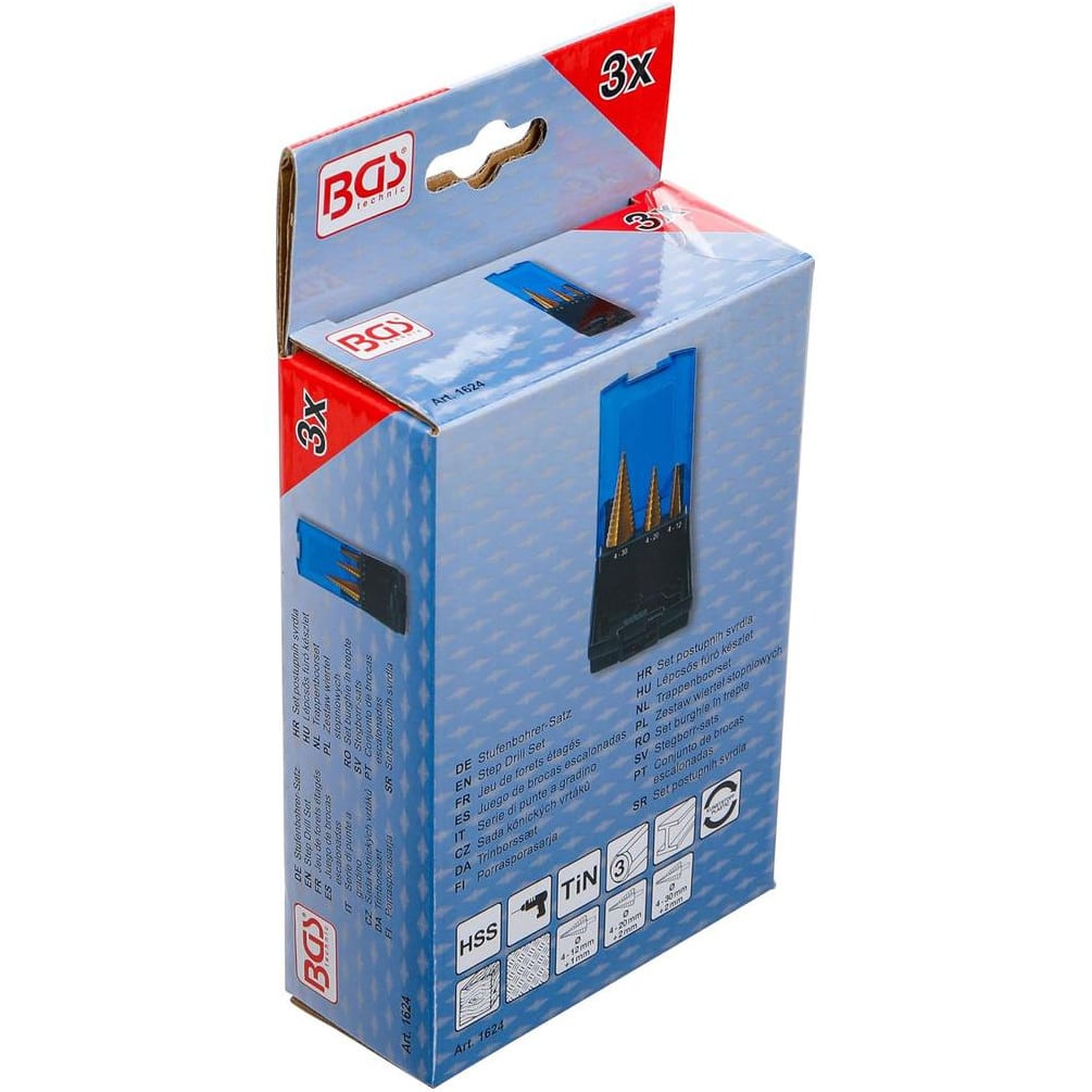 Ref. BGS-1624En savoir + sur Jeu de Forets Étagés 3 pcs D.4-30 mm - Nitrure de Titane - Perçage Précis et Durable, Acier - D-Work