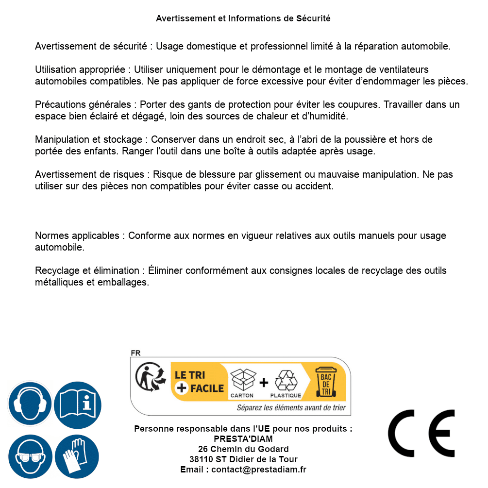 | AVERTISSEMENT et SECURITE | Identification de la personne responsable dans l’UE : Nom : PRESTA'DIAM. Adresse : 26 Chemin du Godard, 38110 ST Didier de la Tour (France). Email : contact@prestadiam.fr. |