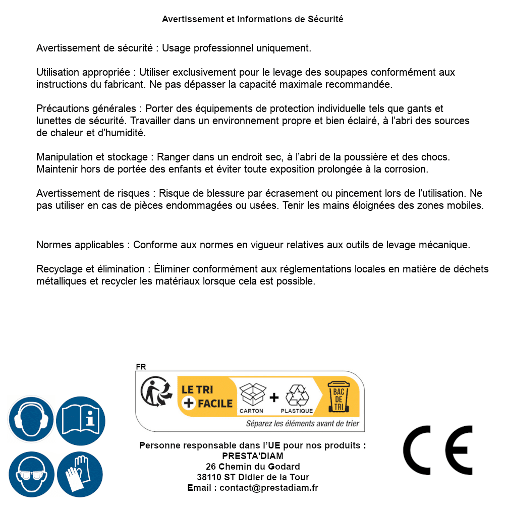 | AVERTISSEMENT et SECURITE | Identification de la personne responsable dans l’UE : Nom : PRESTA'DIAM. Adresse : 26 Chemin du Godard, 38110 ST Didier de la Tour (France). Email : contact@prestadiam.fr. |
