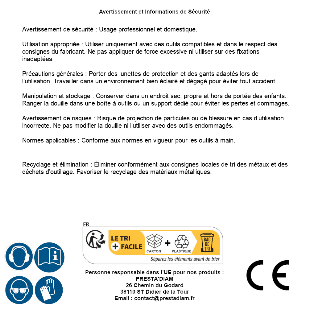 | AVERTISSEMENT et SECURITE | Identification de la personne responsable dans l’UE : Nom : PRESTA'DIAM. Adresse : 26 Chemin du Godard, 38110 ST Didier de la Tour (France). Email : contact@prestadiam.fr. |