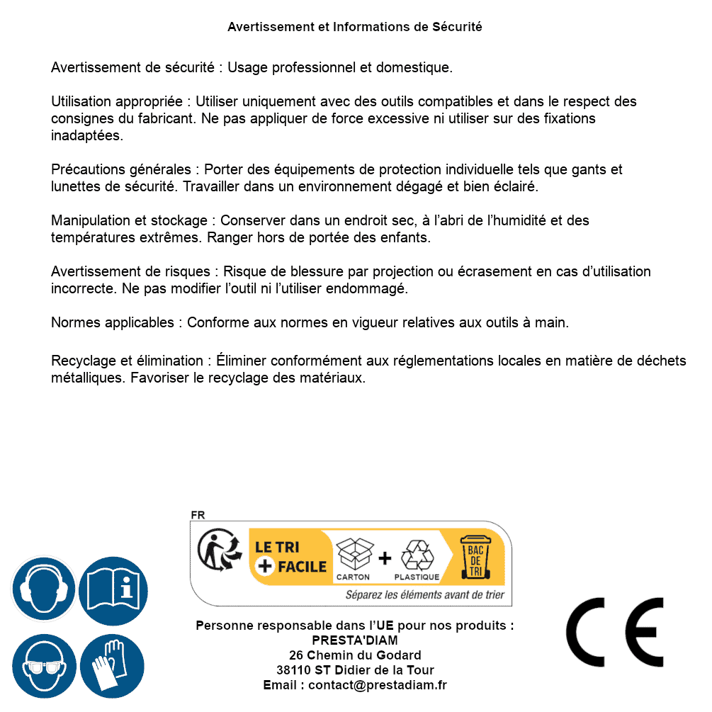 | AVERTISSEMENT et SECURITE | Identification de la personne responsable dans l’UE : Nom : PRESTA'DIAM. Adresse : 26 Chemin du Godard, 38110 ST Didier de la Tour (France). Email : contact@prestadiam.fr. |