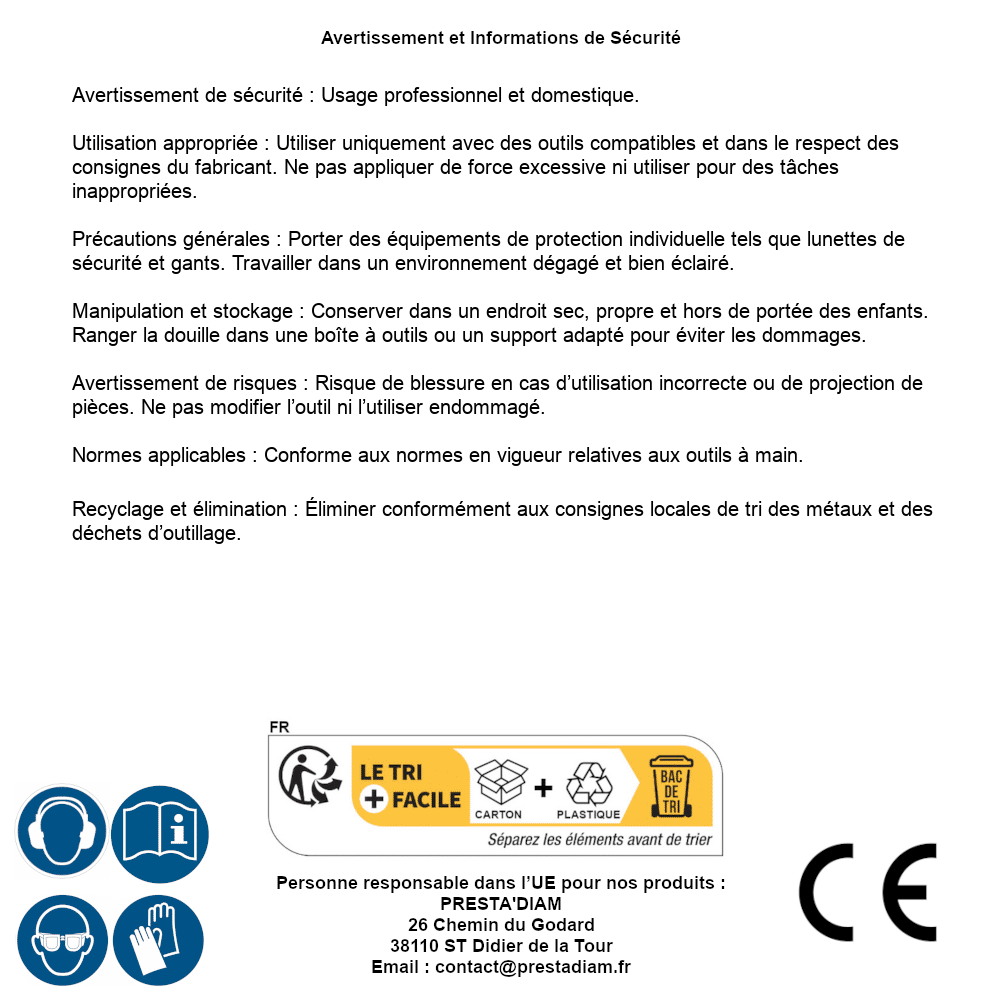 | AVERTISSEMENT et SECURITE | Identification de la personne responsable dans l’UE : Nom : PRESTA'DIAM. Adresse : 26 Chemin du Godard, 38110 ST Didier de la Tour (France). Email : contact@prestadiam.fr. |